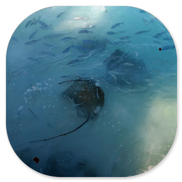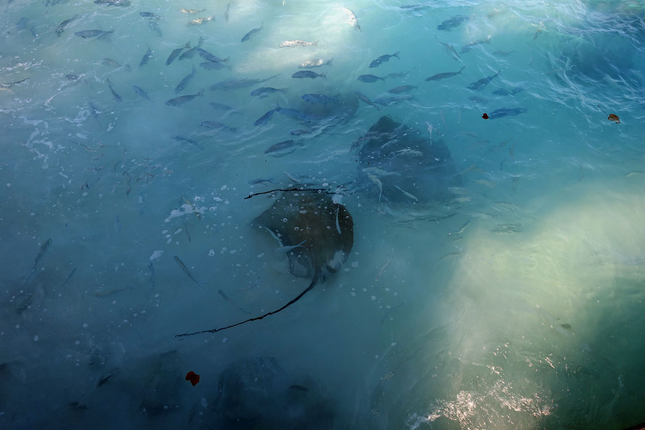 schwarze und braune Mantas sowie einige Stachelrochen dabei. Viele