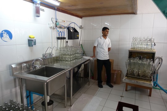 Um 11:00 Uhr nehmen wir an der Führung durch die Anlage teil. 28 Personen haben sich in die Liste eingetragen, um einmal in diesem Resort hinter die Kulissen zu schauen. Das Angebot finden wir hervorragend, weil so wirklich alles transparent gemacht wird. Maria, eine der deutschen Gästebetreuerinnen, erklärt, dass zur Zeit die 260 Gäste im voll ausgebuchten Resort von fast 300 Beschäftigten versorgt werden. Mehr als die Hälfte kommt aus Bangladesh, der Rest zu gleichen Teilen aus Indien und Sri Lanka. Davon sind 25 Frauen. Alles ist hervorragend durchorganisiert: Wir besuchen die Küchen, die Bäckerei, die Wäscherei, verschiedene Werkstätten und schauen uns die Trinkwassergewinnungsanlage an. Hier wird sogar mit Zusatz von Carbonaten ein eigenes Mineralwasser hergestellt.