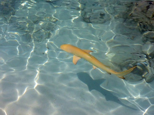 Beim Strandspaziergang beobachten wir einen kleinen Hai, der ganz nah am Ufer entlang schwimmt und uns begleitet. Er lässt sich durch die aufschlagenden Wellen nicht beeinflussen und schwimmt in einer Sandrille den Strand entlang.