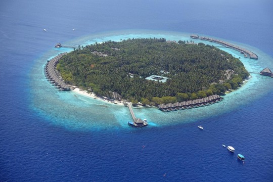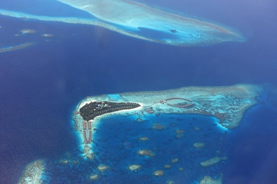 Am Vormittag mache ich meinen ersten Schnorchelausflug. Der Tauchlehrer hat gesagt, man soll sich mit der Strömung treiben lassen und die Strömungsrichtung könne man gut dran erkennen, in welche Richtung sich die an den Bojen befestigten Boote drehen würden. Das ist ein prima Tipp. Auf der Luftaufnahme, die das Resort gemacht hat, kann man die schmalen Durchgänge durch die Korallen bis zum steil abfallenden Riff gut erkennen. Die Wasservillen liegen am Nordende der Insel und am Südende ist der große Sandbereich mit guten Schwimmmöglichkeiten auch bei Ebbe.