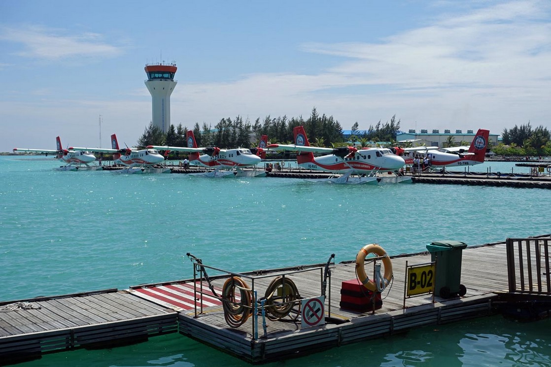 Unser Gepäck ist auch schon da und am Ausgang finden wir schnell einen Repräsentanten von Reethi-Beach, der uns zum Flugschalter der Trans Maldivian Airways bringt. Die TMA regeln mit ihren 45 Wasserflugzeugen den größten Teil des Zubringerverkehrs zu den einzelnen Inseln. Wir bekommen Tickets für das Wasserflugzeug nach Fonimagoodhoo und können sofort in den Shuttlebus steigen, der uns zum Wasserflugzeug-Terminal bringt, das gar nicht so weit entfernt ist. Um 11:00 Uhr sind wir dort müssen allerdings noch bis 12:30 Uhr warten, weil dann die Maschine starten soll. Für die Wartezeit bekommen wir einen Coupon für ein Getränk und ein Sandwich, sodass wir uns zu einem gemütlichen Cappuccino in die luftige Abflughalle setzen und den an - und abfahrenden Wasserflugzeugen zuschauen. Das ist höchst interessant, wie dieser Transferverkehr so schnell und reibungslos abgewickelt wird. Allerdings kommt ab und zu eine Durchsage, dass irgendein Flug verschoben wurde und der Abflug nun auf einem anderen Terminal erfolgt.
