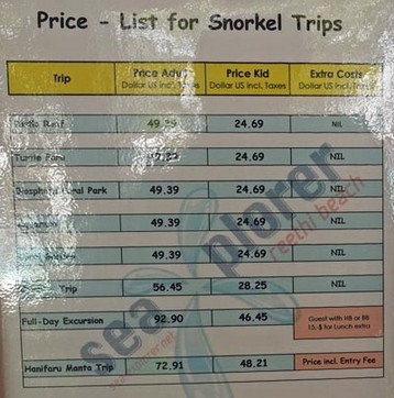Wer also auf die Malediven fahren will, um zu schnorcheln, wählt besser eine andere Insel, denn interessante oder aufregende Fischbeobachtungen kommen nur dann zustande, wenn man an einer der Fahrten teilnimmt, die vom "Sea-Explorer" angeboten werden. Diese führen zu verschiedenen Riffen in der Umgebung und müssen teuer bezahlt werden. Wer aber bereit ist, für jede Schnorcheltour 50 Dollar auszugeben, dem kann ich Reethi Beach durchaus empfehlen, denn mich haben die Preise erst einmal abgeschreckt: Dazu kommen noch 23,2% für Steuern und Service! Dive-Spots gibt es genug: 80 Tauchgründe in einer Entfernung von 10 bis 70 Minuten mit dem Boot. Wer Spaß daran hat, kann hier viel Geld loswerden. Andererseits kostet eine solche komfortable Schnorcheltour nicht mehr als 10 Glas Bier - und so gesehen, ist das gar nicht mal so teuer.