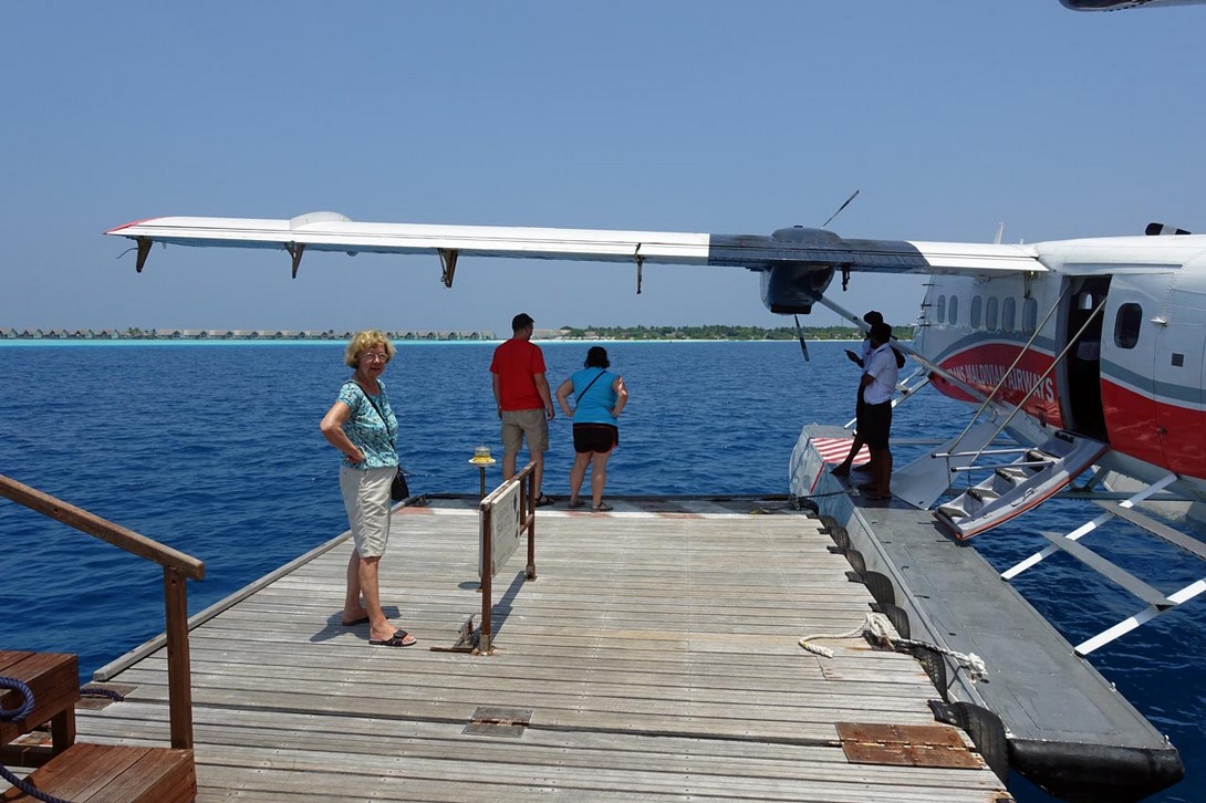 Wir erfahren, dass wir zuerst noch zur Landeplattform des Four Seasons Resorts auf der Insel Landaa Giravaaru fliegen, um dort zwei Passagiere an Bord zu nehmen. Es kommt auch schnell ein Boot vom Four Seasons mit zwei Japanern, die zu uns in das Wasserflugzeug steigen. Bei der Zwischenlandung blicken wir sehnsüchtig auf die Insel Landaa Giravaaru mit dem tollen Four Seasons Resort und sind ganz neidisch, weil wir uns nämlich in der Zwischenzeit im Internet einmal das Hotel angesehen haben, das wir uns wegen der hohen Übernachtungspreise leider nicht leisten können, denn für 14 Tage muss man für den Luxus dort schon etwa 15 000 Euro pro Person auf den Tisch legen.