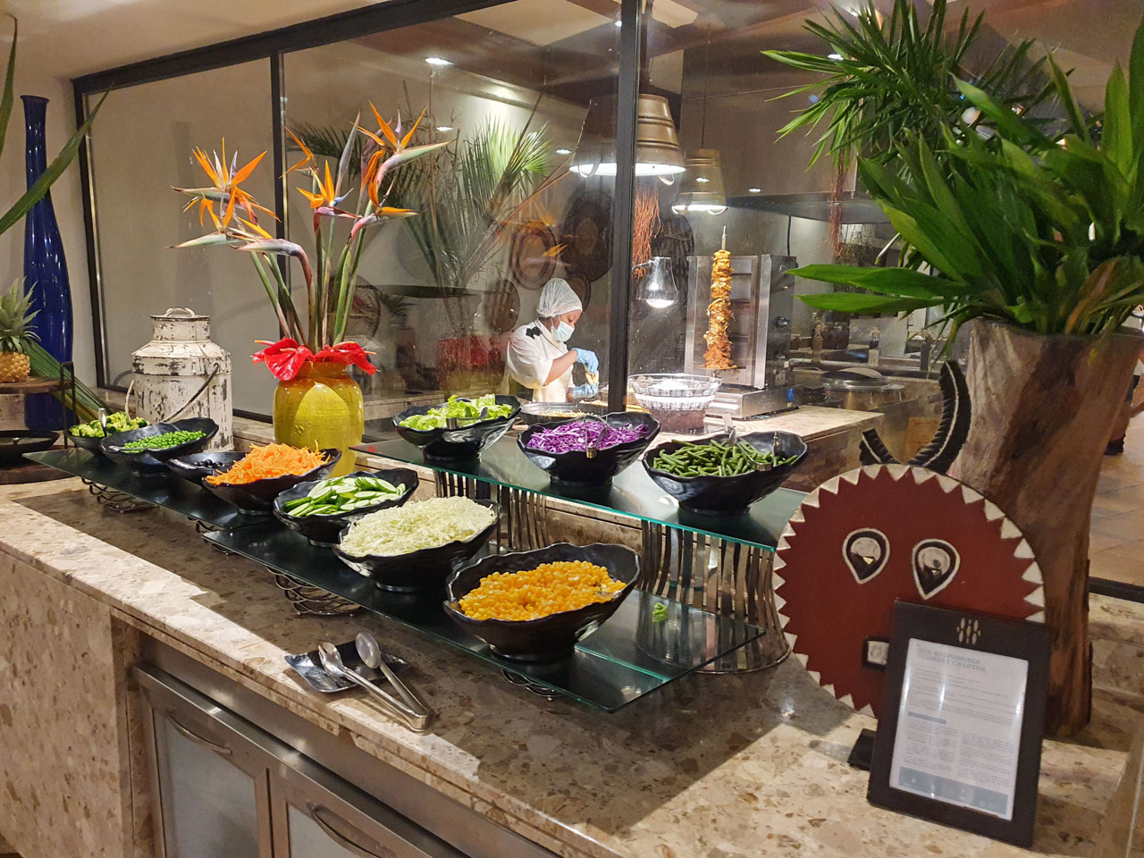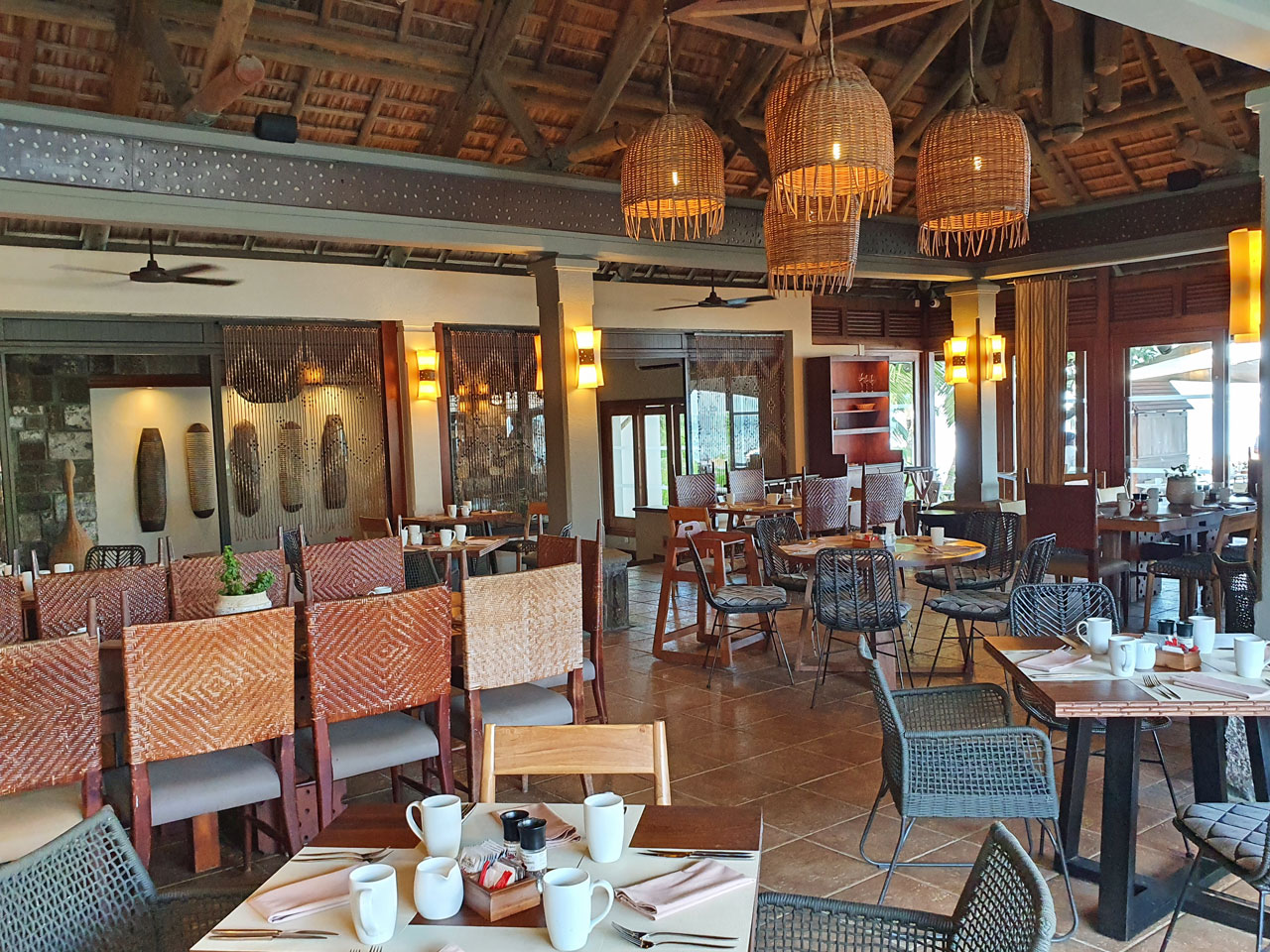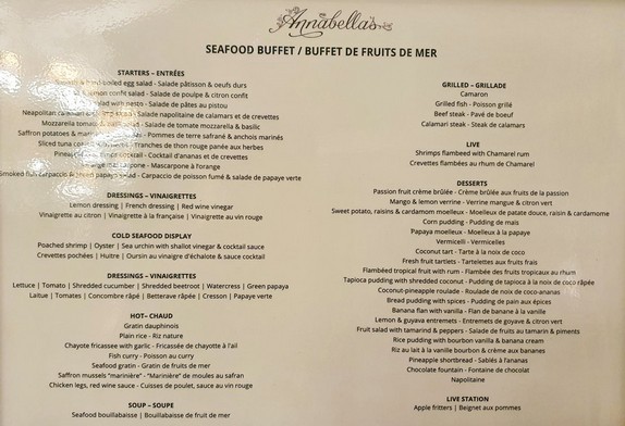Am Abend ist eine geschlossene Veranstaltung im Heritage Awali und wir haben stattdessen einen Tisch im Restaurant Annabelle des Telfair Hotels reserviert. Dort wird ein ordentliches Fischbüffet angeboten, obwohl der Gebläsekrach im offenen Küchenbereich unerträglich ist. Draußen auf dem Grill werden Shrimps mit Rum flambiert