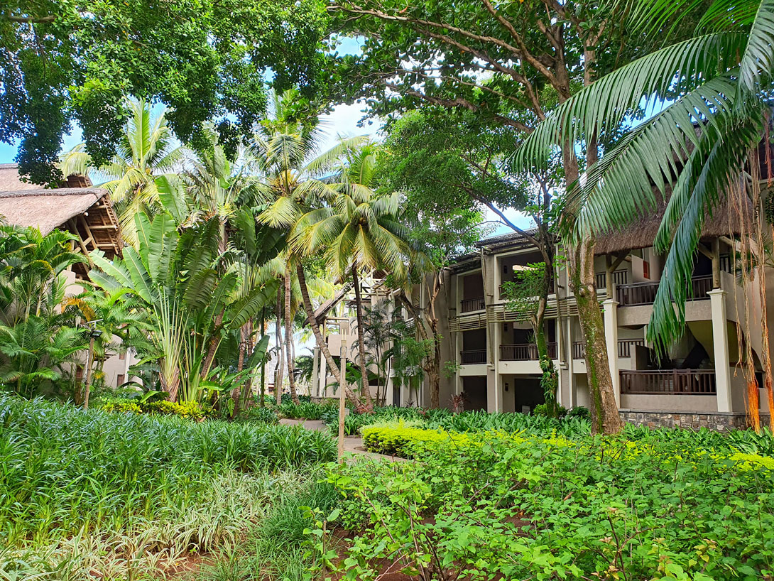 Direkt neben dem öffentlichen Strand beginnt der Strand des Beachcomber Resorts Trou aux Biches. Das kann man an den Liegen und den grünen Handtüchern erkennen, die die Hotelgäste mitbringen. Wir spazieren einmal durch den Hotelgarten und schauen uns von dort den Strand an. Hier unsere Eindrücke: