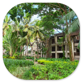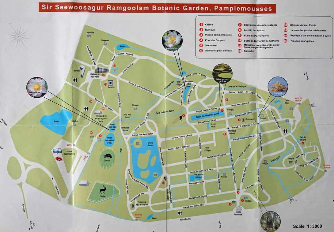 Für 200 Rupien bekommen wir eine Eintrittskarte und einen Plan, mit dem wir uns zurechtfinden wollen, denn es sind alle Straßen und Wege mit Namen aufgezeichnet. Heute sind nur ganz wenige Besucher im Park. Da wir vor 20 Jahren schon einmal hier waren, hoffen wir zielgerichtet zu den Teichen mit den Wasserlilien und Seerosen zu kommen. Auf die Hirsche, Enten und Schildkröten wollen wir verzichten, weil wir die schon einmal in der vorigen Woche im Süden der Insel im Coloured Earth Geopark gesehen hatten. Wir nehmen uns zwei Stunden Zeit für einen Spaziergang durch den großen Park, der eigentlich ganz erholsam ist, denn unter den schattigen hohen Bäumen spürt man nicht die Hitze des Tages, denn immerhin sind es jetzt noch 32°C.Wir marschieren also geradeaus los und sind auch ziemlich schnell am Chateau de Mon Plaisir, an dem gerade Bauarbeiten stattfinden. Nach kurzer Zeit merken wir, dass wir uns auf den verschlungenen Wegen kräftig verlaufen haben, was allerdings kein Wunder ist, denn fast überall fehlen die Schilder an den Wegen. Der Park ist schlecht gepflegt und die Bezeichnungen an den Bäumen und Pflanzen sind so verwittert, dass sie fast alle unlesbar sind. Das ist sehr schade.