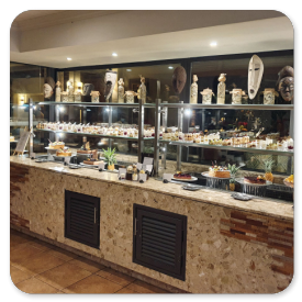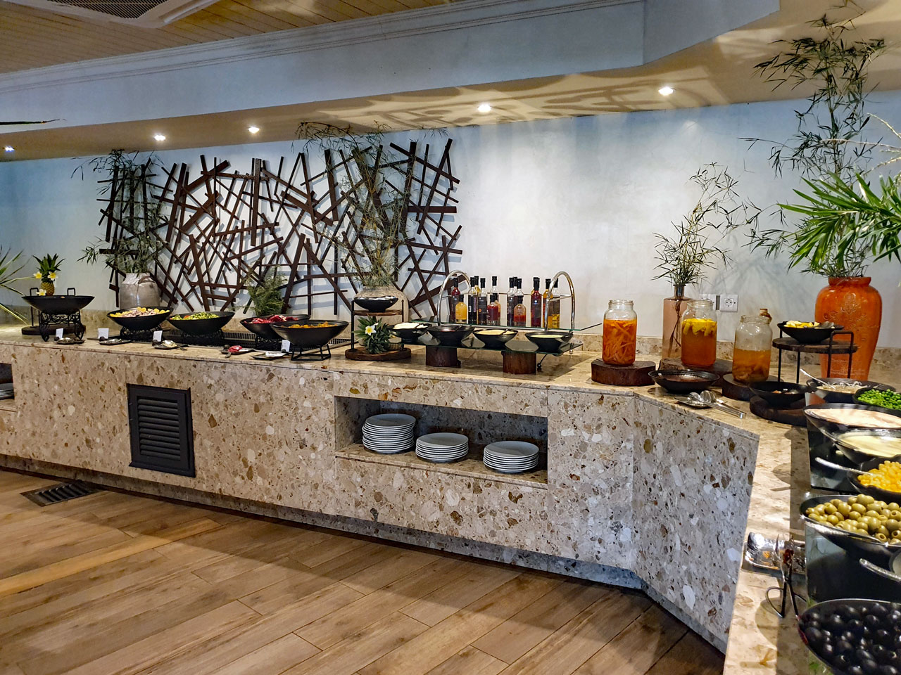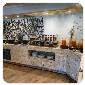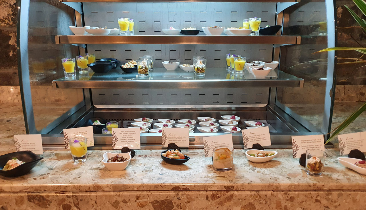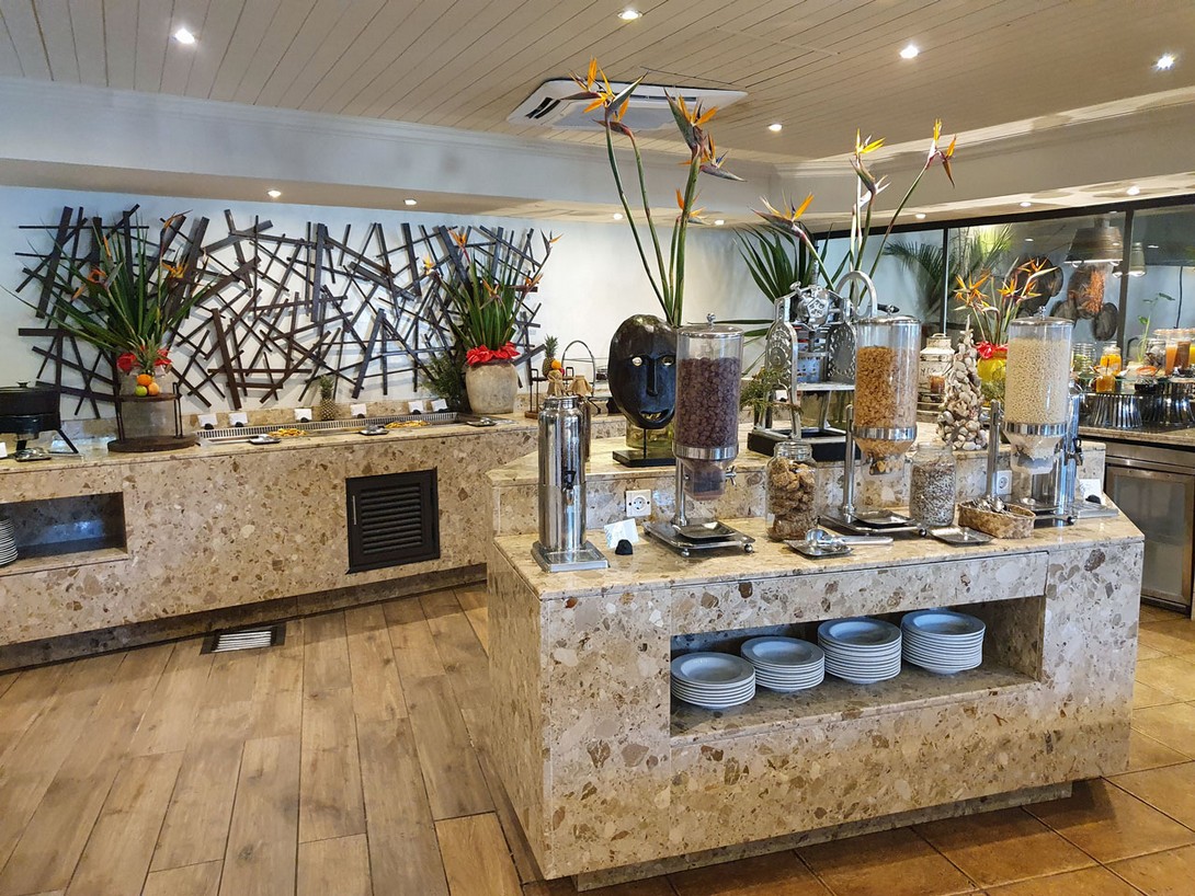 Überrascht sind wir von dem gut organisierten Frühstücksbüffet, denn ein Teil ist einem klimatisierten Bereich hinter einer Schiebetür untergebracht, während sich die 3 Kochstationen und die Warmhalteplatten im Nebenraum befinden. Kaffee und Cappuccino werden gebracht und das Servicepersonal ist sehr freundlich und anschließend schnell beim Abräumen.