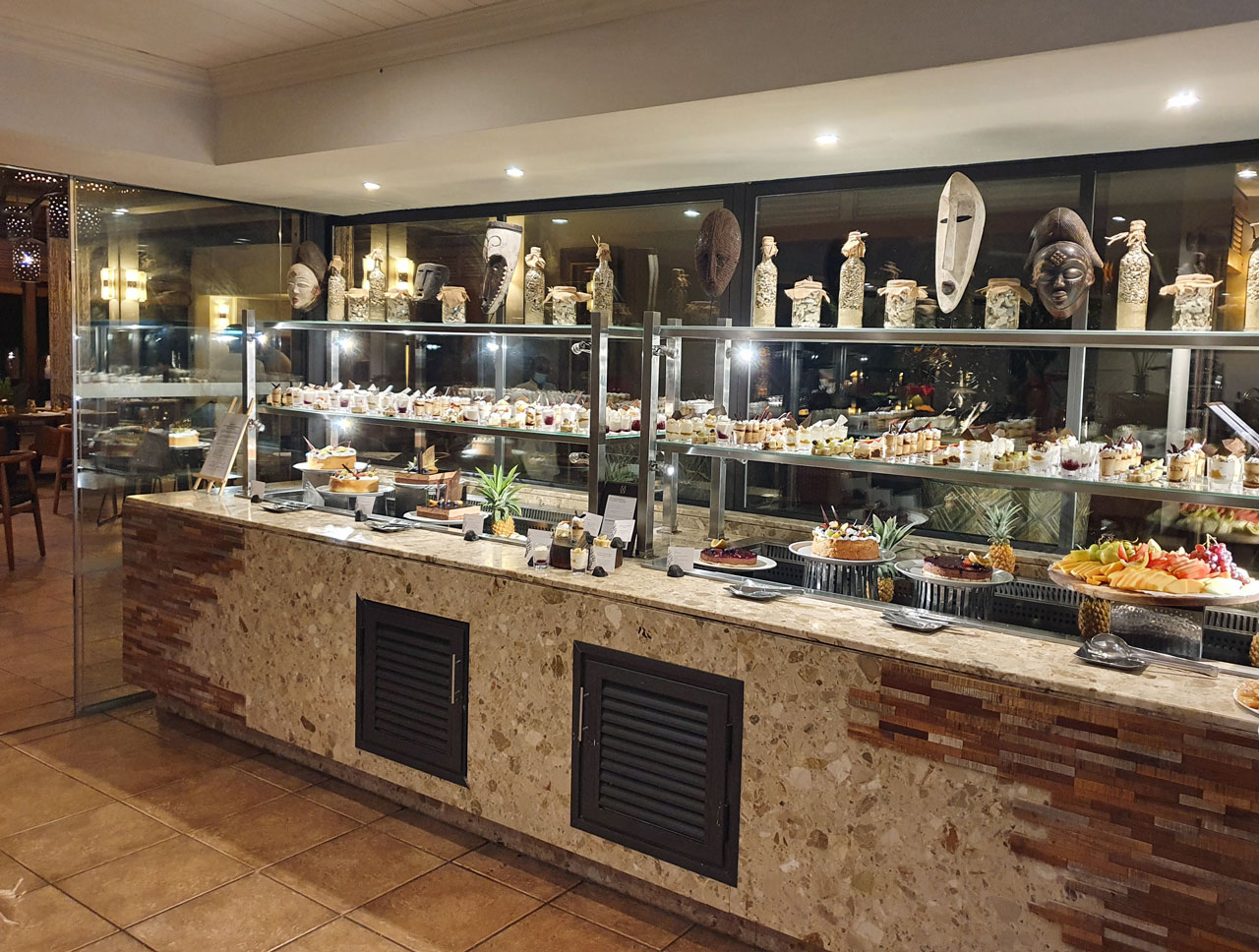 Das abendliche Büffet im Savana Restaurant ist heute mediterran und sehr lecker. Wir probieren viele Kleinigkeiten und der Service ist nach einigen Trinkgeldern sehr aufmerksam. Inge und Doris haben an dem südafrikanischen Rosé Gefallen gefunden und ich bleibe beim Bier. Beeindruckend ist auch das Vorspeisenbüffet und Dessertbüffet in dem gekühlten Nebenraum. Jedenfalls sind wir mit dem Essen, dem Hotel, dem Zimmer und dem Ambiente sehr zufrieden.