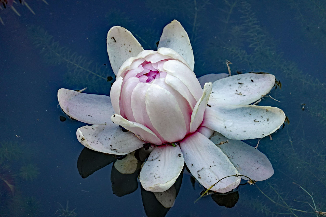 Immerhin erklärt uns einer der Gärtner den richtigen Weg zu dem geschwungenem Teich mit den langstieligen Wasserlilien. Leider blühen zur Zeit nur wenige Pflanzen, aber mit dem Spiegelbild des Himmels iauf der Wasseroberfläche sieht alles dennoch sehr malerisch aus.