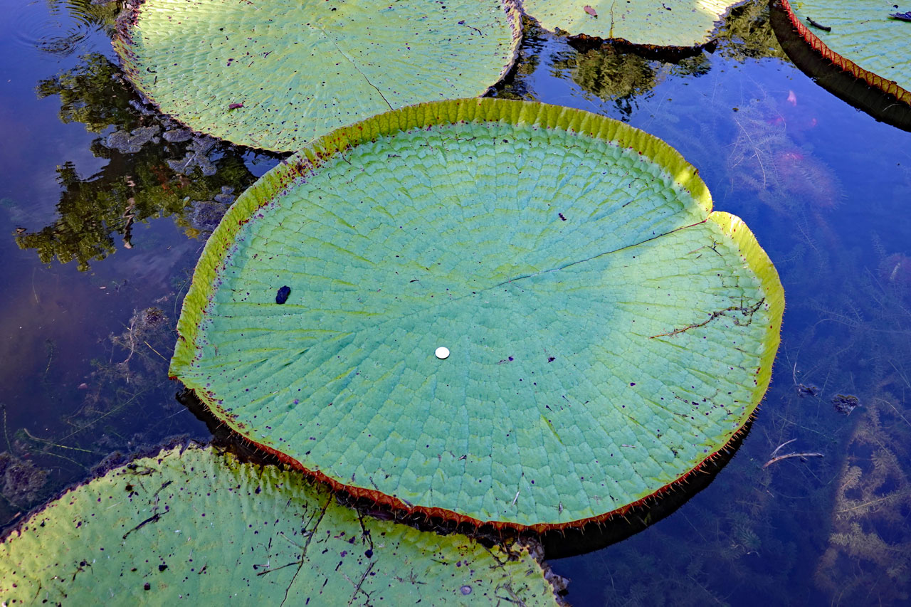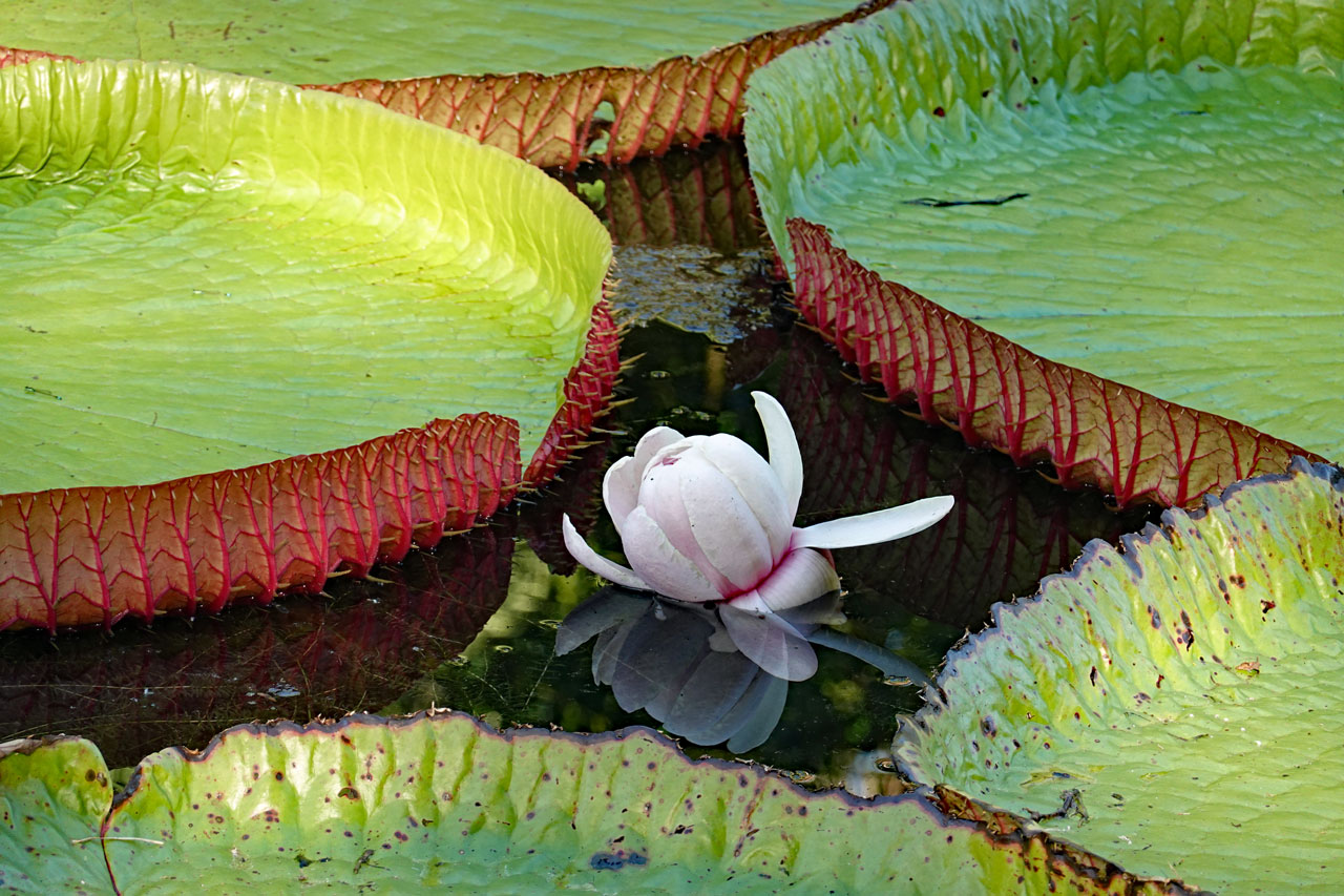 Von diesen Amazonas Seerosen gibt es nur zwei Arten und sie heißen so, weil sie ursprünglich nur dort existierten. Sie sehen wunderschön aus mit ihren riesigen Blättern, die bis zu 60kg tragen können. Sie haben 6-7m lange Stiele und öffnen ihre Blüten nur in der Nacht. Die Bestäubung erfolgt durch Käfer, die in der ersten Nacht in die offenen Blüten krabbeln, am darauffolgenden Tag in der geschlossenen Blüte gefangen bleiben und erst in der zweiten Nacht wieder freigelassen werden. Während die Blüten tagsüber geschlossen sind, wechseln sie ihre Farbe von weiß in der ersten Nacht zu einem dunklen purpur-rot in der zweiten Nacht.
