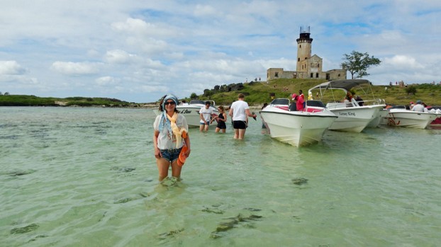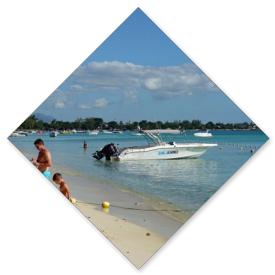 1. Ausflug mit dem Speedboot oder Katamaran zur Ile aux cerfs. Es handelt sich um einen 8-stündigen Tagesausflug, wobei wir morgens um 8:00 Uhr am Hotel abgeholt werden und zum Startpunkt an die Blue Bay Bucht gefahren werden, wo die Boote von Aqua Soleil am Strand des Shandrani Hotels abfahren. Der Strand soll schöner sein als unserer hier in Bel Ombre, lediglich die Nähe des Flughafens könne stören. Das gefällt uns schon einmal ganz gut, weil unterwegs zur Insel Ile aux cerfs zwei Schnorchelstopps eingelegt werden und auch auf der Insel selbst eine Möglichkeit dazu bestehen soll. Der Preis wird mit 5950 Rupien pro Person angegeben, das sind etwa 130 €