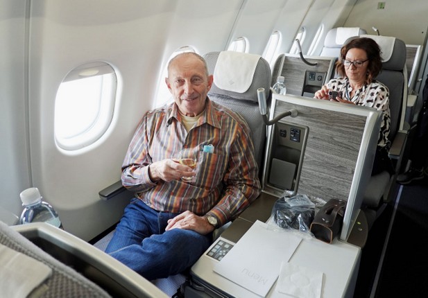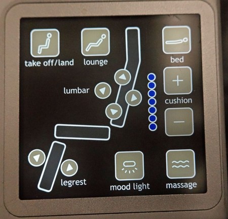 Ich glaube, ich habe mein neues Lieblingsflugzeug gefunden: den Airbus A330-300. Jedenfalls von der Innenausstattung in der Business-Class her war ich begeistert. Einzelsitze an den Außenseiten mit einem eingebauten Tisch daneben, genügend Fußraum für die horizontale Liegeposition, gepolsterte Gurte, Massagefunktion im Sitz, Netz- und USB-Buchsen und ausgetüftelte Ablageflächen für Flaschen, Handys und Kleinigkeiten. Dazu ein raffiniert versteckter ausklappbarer Tisch mit Höhenverstellung und eine komfortable elektrische Sitzsteuerung.