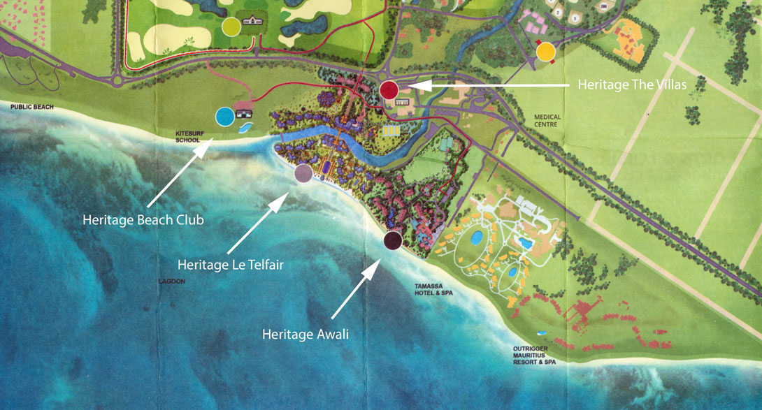Ein Stückchen weiter schließt sich das nächste Resort an: das Outrigger Mauritius. Auch hier sind die Strandbedingungen identisch mit den beiden vorigen Hotels. Das geht deutlich aus dem Luftbild von dem Resort hervor, das Outrigger auf seiner Webseite anbietet: