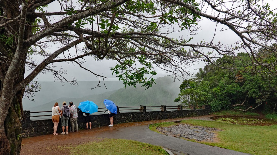 Das ist sehr schade. An den Souvenirständen wollen wir wegen des Regens auch nicht stehen bleiben, sondern fahren weiter zum Chamarel Wasserfall. Unterwegs kommen wir auch am Piton de la Petite Rivière Noire vorbei, dem mit seinen knapp 830 Metern höchsten Berg der Insel. In Chamarel kommen wir zwar auch im Regen an, aber als ich den Wanderweg am Aussichtspunkt des Wasserfalls nach oben klettere, um von dort ein Foto zu schießen, hört der Regen auf und ich kann sogar ein kleines Video aufnehmen.