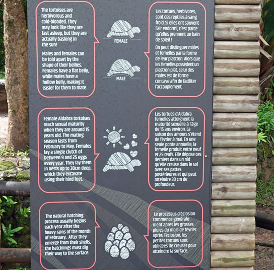 Es gibt in dem Park auch einen Garten mit Riesenschildkröten, die man von den Seychellen hierhin gebracht hat. Ähnlich wie im Pamplemousse Botanical Garden im Norden von Mauritius sollen sie als Touristenattraktion dienen.