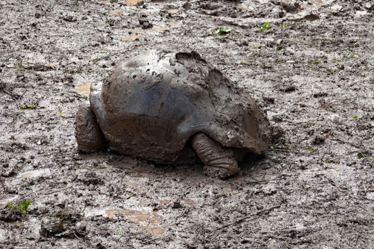 Die Schildkröten suhlen sich in dem braunen Schlamm und sehen dar nicht gut aus. Man kann die Augen und das Maul überhaupt nicht richtig erkennen. Nachdem wir im Februar dieses Jahres die Riesenschildkröten in ihrer natürlichen Umgebung in Galapagos gesehen haben, erkennen wir um so deutlicher hier die Zoo-Situation. Die ist unwirklich für die Tiere.