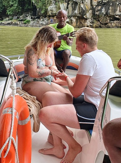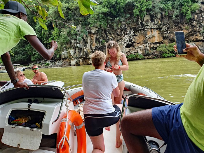 An der Zahl der Boote und der wartenden Gruppen erkennen wir, dass hier der Start von einer der typischen Massenveranstaltungen erfolgt. Dennoch scheint es wegen der nur 9 Personen für das Boot (max. sind 14 Personen zulässig) recht privat und amüsant zu werden.