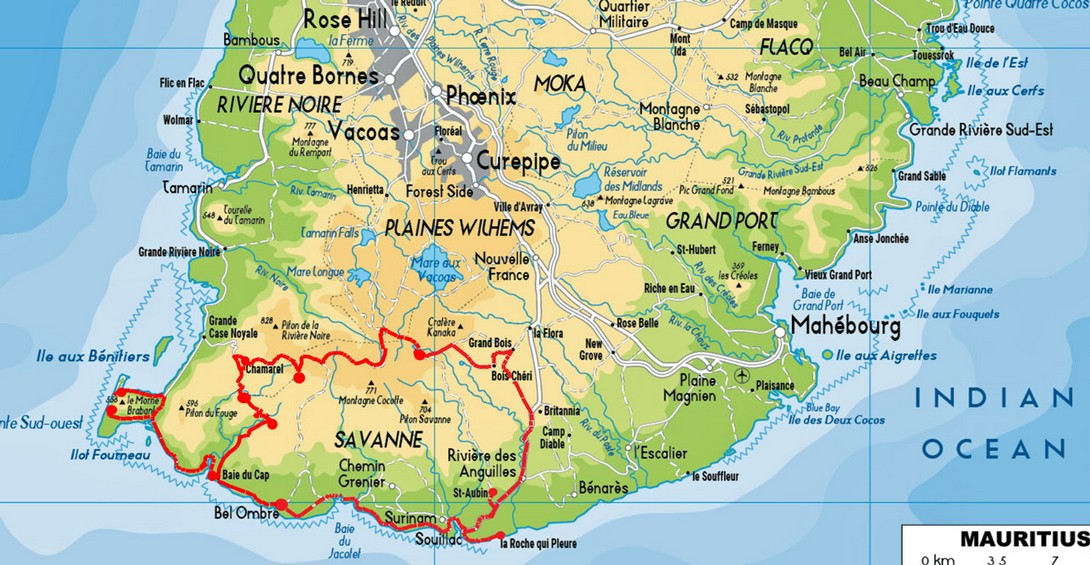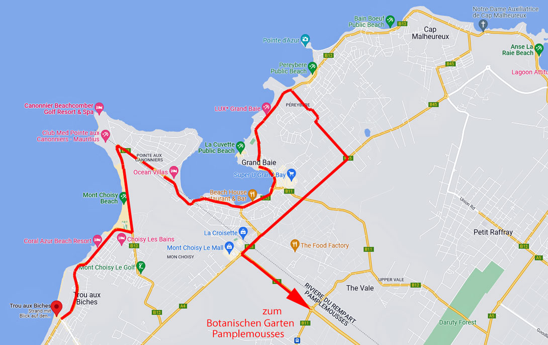 Pünktlich um 9:00 Uhr steht unser Fahrer Sharif mit seinem Pkw vor dem Hoteleingang und wir besprechen mit ihm unsere Wünsche und die sich daraus ergebende Route für den heutigen Tag. Er schlägt vor, dass wir über Le Morne an der Küste entlang nach Norden fahren bis in die Hauptstadt und uns dort die wichtigsten Sehenswürdigkeiten anschauen. Danach sollten wir an der Küste weiter nach Norden fahren und uns die Strände anzusehen. Zum Schluss würde er uns dann in den Botanischen Garten bringen. So ergibt sich unsere Fahrtroute für den heutigen Tag: