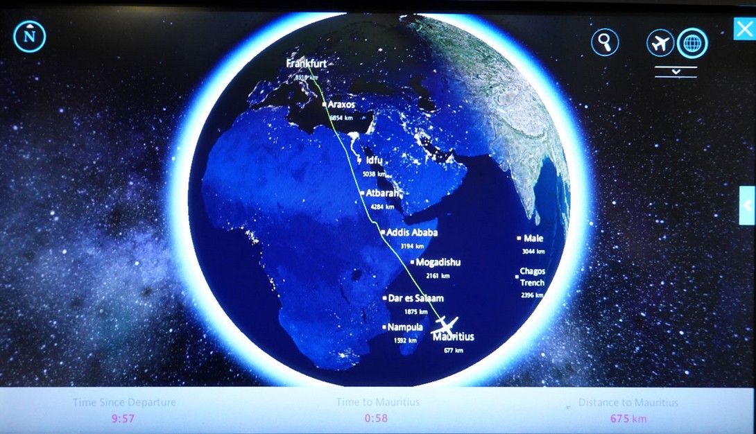 Als Hauptspeise wählte ich gegrilltes Jerk Chicken mit Ananas-Koriander-Chutney, gegrillter Ananas auf Kokosreis mit roten Bohnen. Der hervorragende rote Medoc passte dann anschließend auch noch sehr gut zu dem Cheddar, Cambozola Grand Noir und Reblochon mit roten Trauben. Der abschließende Baileys sorgte dann für die nötige Bettschwere, um den 11 Stunden Flug von Frankfurt nach Mauritius gut zu überstehen. Dazu hatte der Sitz die entsprechenden Motoren, die ich alle ausprobiert habe, bis ich über die Massage die richtige Liegeposition gefunden hatte