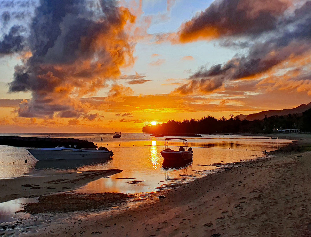 Von unserem Standpunkt aus versinkt zwar die Sonne nicht im Meer, sondern verschwindet hinter den Bäumen des öffentlichen Strandes von Bel Ombre, aber es entsteht eine tolle Abendstimmung.