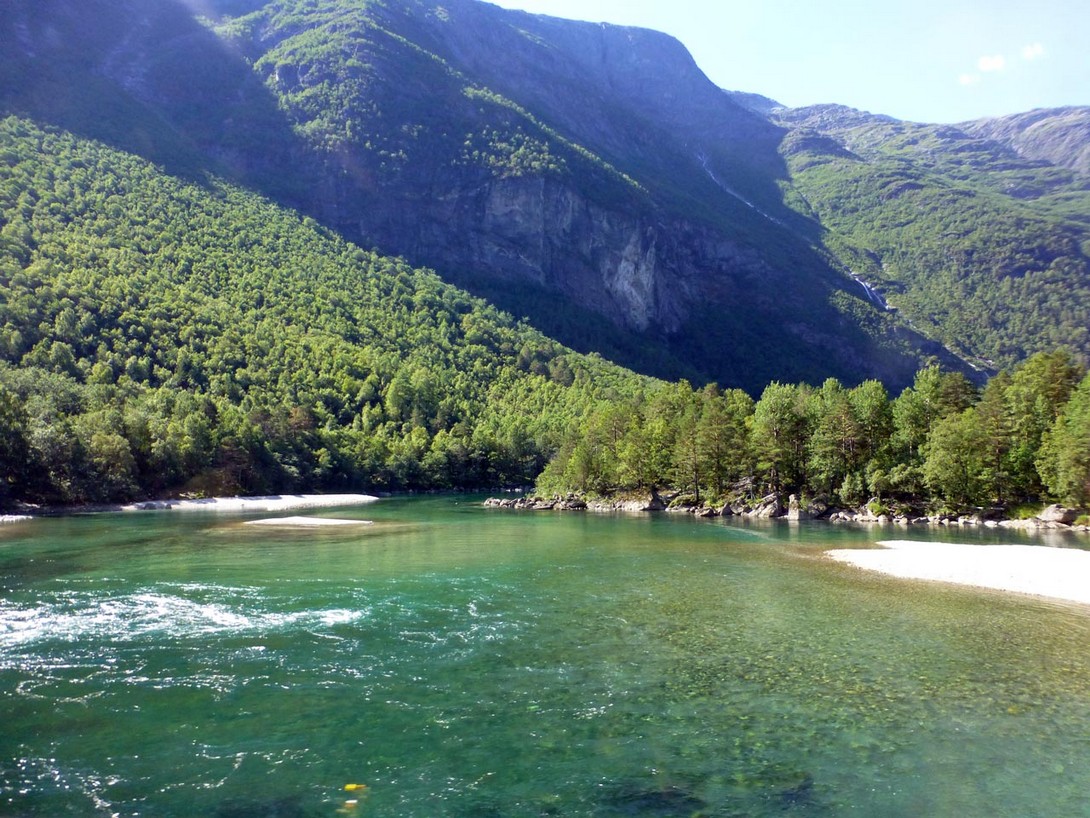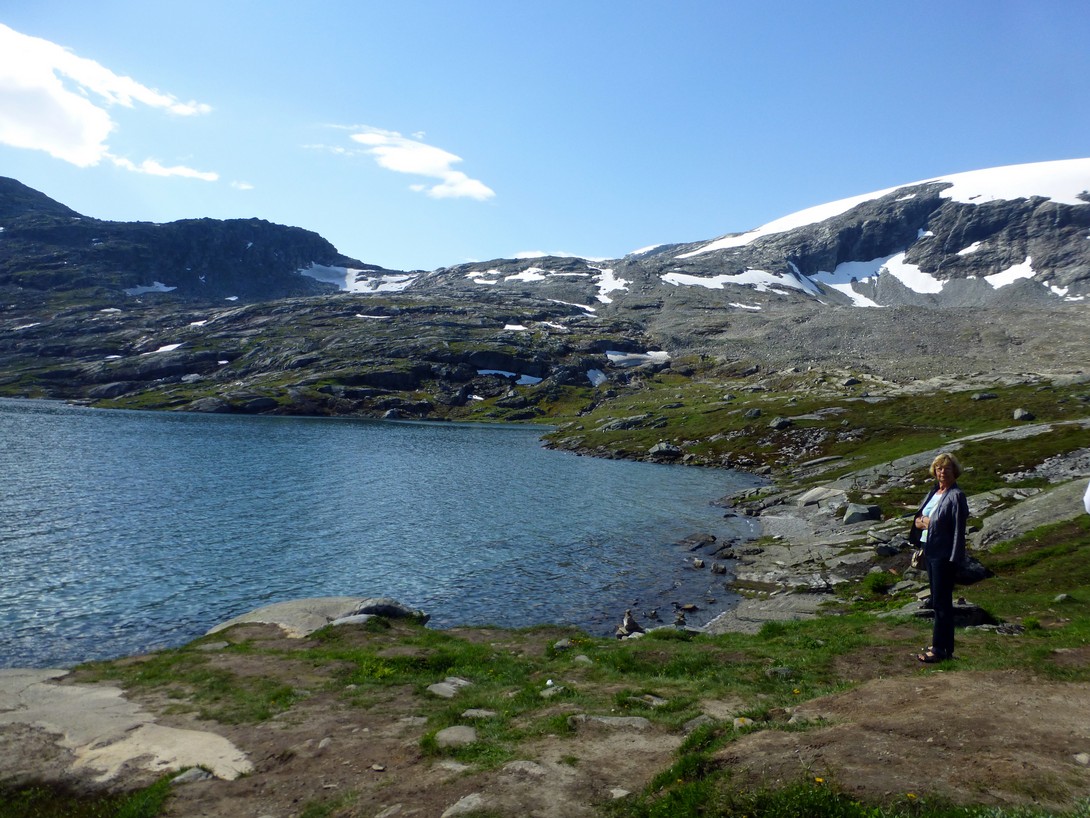 Von dort führt ein Wanderweg zum Gletschersee. Den spazieren wir entlang zum Gletscher. Die Landschaft ist wunderschön und genau so, wie wir uns Norwegen vorgestellt haben. Wir machen viele Fotos und genießen den Vormittag in der sonnig grünen Umgebung mit herrlich sauberer Luft.