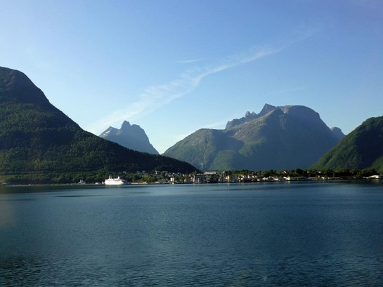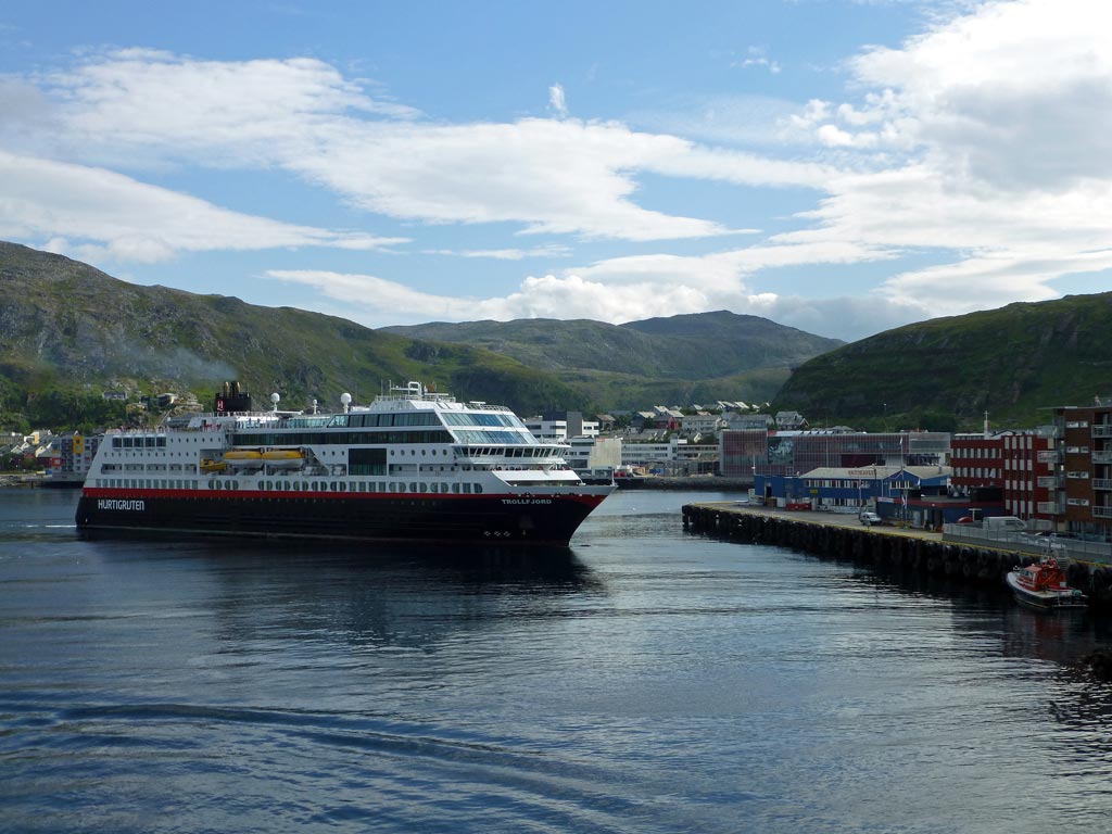 Und 5 Minuten nach unserer Abfahrt legt die "Trollfjord" der Hurtigruten-Flotte mit elegantem Schwung am Kai an und ist in weniger als 5 Minuten festgemacht, was bei unserem Schiff heute morgen 20 Minuten gedauert hat. Da sieht man den Unterschied zwischen einem Kapitän, der seine Anlegestellen kennt und einem Kreuzfahrtschiff.