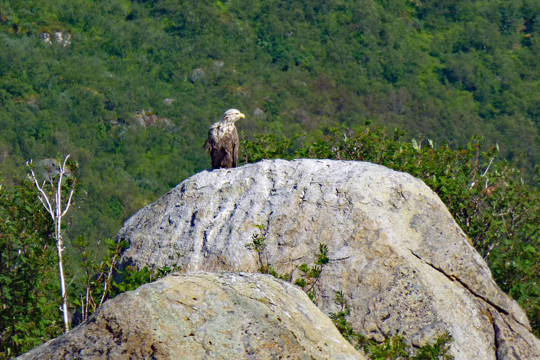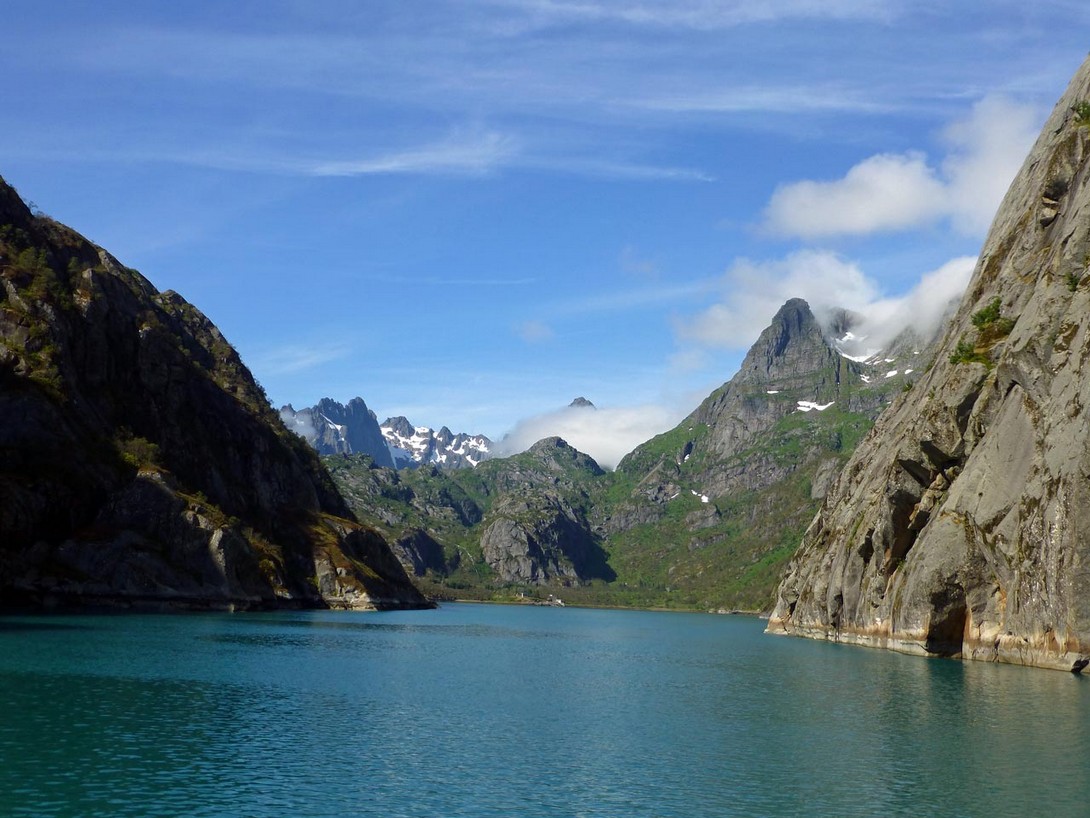 So starten wir unseren heutigen Ausflug in den Trollfjord (85 €) ganz unten vom Deck B aus, indem wir auf das kleine Ausflugsboot umsteigen, das uns zum Trollfjord bringen soll. Berühmt geworden ist der Trollfjord durch die Trollfjordschlacht 1880, in der sich die Fischer auf Ruder- und Segelbooten den Fischern auf Dampfschiffen gegenüberstanden. Unsere Fahrt geht zunächst an der malerischen Kulisse von Svolvaer vorbei und dann brauchen wir noch mehr als eine Stunde bis zur engsten Stelle - nur 100m breiten Durchfahrt - des Trollfjords. Ab hier wird es erst interessant, weil die Felsen steil sind und links und rechts näher heran kommen. Einen Fischadler und viele Möwen können wir bei ihrer Jagd nach Fischen beobachten.