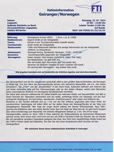 Nachdem uns die Kreuzfahrt durchs Rote Meer mit der MS Berlin im vorigen Jahr so gut gefallen hatte, haben wir dieses Jahr wiederum die Schiffsreise „Nordland pur“ vom 15.7. bis 25.7.2014 gebucht. Wir hatten die Angebote mit den Hurtigruten verglichen, die ja hauptsächlich diese Route fahren und uns für die MS Berlin entschieden, weil sie nur 11 Häfen anläuft, während die Hurtigruten an 34 Stationen halt macht und ihre Fracht ablädt. Wir wollten einfach nicht zu jeder Tages- und Nachtzeit in irgendeinem Hafen einlaufen und uns das Gerumpel des Be- und Entladens anhören. Stattdessen gefiel uns die Route der MS Berlin auch deshalb besser, weil sie die wichtigsten Orte von Bergen bis zum Nordkap einschloss und dort entsprechenden Ausflüge anbot.Die Anreise war ein wenig kompliziert, weil der Starthafen Tromsø war, den man per Flug nur mit mehrmaligem Umsteigen von Düsseldorf erreichen kann. Wir wählten dann schließlich den von FTI Cruises angebotenen Zubringerflug mit Air Berlin und Transfer für 519 Euro, was wir ziemlich teuer fanden. Andere Gäste hatten unterschiedliche Fluggesellschaften gewählt und waren über Stockholm und Oslo geflogen. Das war zwar billiger, dauerte aber wesentlich länger und brachte einige Unannehmlichkeiten mit sich, weil nämlich teilweise das Gepäck nicht mitkam.