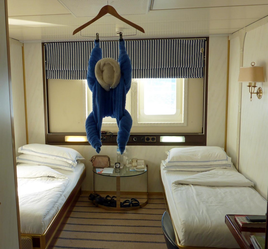 Die ist ganz in Ordnung. Mehr kann man von 15 m² eigentlich nicht erwarten. Ein Schlüssel funktioniert nicht und mit dem Schlüssel für die abschließbare Kommode muss man sich erst einmal anfreunden. Aber wir haben zwei Fenster, zwei durchaus akzeptable Betten und genügend Stauraum, um unsere Sachen unterzubringen. Schließlich habe ich für das "Captain´s Dinner" auch ein Sakko und eine Krawatte mitgebracht. Und wenn man davon ausgeht, dass am Abschluss der Fahrt ein Gala-Abend stattfindet, könnte die Krawatte zweimal zum Einsatz kommen. Daher bin ich ganz dankbar, dass wir einen zweiflügeligen Kleiderschrank mit vielen Bügeln vorfinden, auf die ich meine Sachen hängen kann. Zwei Bademäntel und zwei blaue Strandhandtücher entdecken wir auch zwischen den Rettungswesten. Im Bad scheinen die Armaturen neu zu sein, denn es blitzt der Chrom aus der Dusche. Die ist zwar klein, aber alles funktioniert einwandfrei. Unsere Koffer passen nicht unter das Bett; gerade mal 2cm fehlen an der Höhe. Wahrscheinlich hatte man in den 80er Jahren, als das Schiff vom Stapel lief, noch andere Reisekoffer. Der 23" Flachbild-Fernseher ist jedenfalls neueren Datums; er zeigt ZDF, Sat 1, Arte und andere Sender, aber nicht die ARD. Inge ärgert das ein wenig, weil sie auch auf Reisen gern die Tagesschau sehen möchte, um über alles informiert zu sein. Aber vielleicht hängt es ja auch von den Satelliten ab, die nicht immer hier oben zwischen den Fjorden den Empfang garantieren können. Schließlich sind wir in Tromsø, das ist ein ganzes Stück nördlich vom Polarkreis.