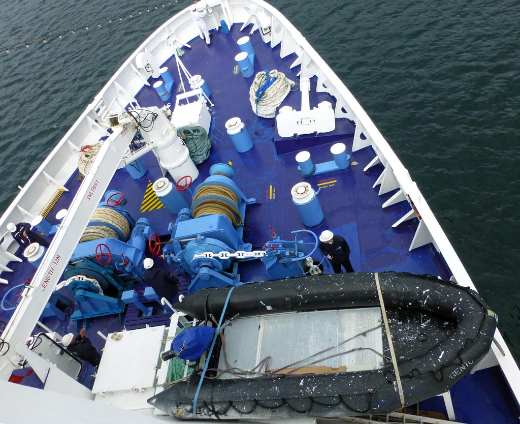 Wahrscheinlich ist aber auch die osteuropäische Besatzung mit solchen Malerarbeiten total überfordert, denn sie haben nicht nur alles miserabel gepinselt, sondern das Schlauchboot auf dem Bug ebenfalls vollgekleckst. Eigentlich schade, denn alles das setzt den Wert des Schiffes bei seinen Besuchern doch ziemlich herab.