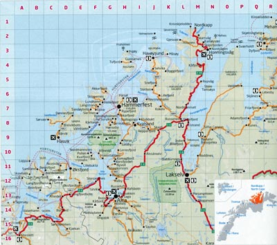 Die Sonne scheint, als wir kurz nach halb acht aufstehen. Hell war es die ganze Nacht - immer, wenn man aufwachte, schien die Sonne in die Kabine. Beim Frühstück im Hauptrestaurant ist das Schiff erst bei der Gasförderanlage und noch ein Stück vom Hafen in Hammerfest entfernt. Kurz nach 9:00 Uhr legt es am Hurtigruten-Kai an und wir machen einen Spaziergang durch das Städtchen mit 8000 Einwohnern, von denen jetzt am frühen Morgen noch nicht viel zu sehen ist. Die Geschäfte sind geschlossen und die Banken auch. Dabei hatten wir uns vorgestellt, hier einige Euros in Kronen umwechseln zu können, weil auf dem Schiff keiner wechselt und in den Städten keiner Euros annimmt.Aber immerhin ist die Touristik-Info geöffnet und wir finden hier hervorragende Detailkarten in dem kostenlosen Reiseführer Nordnorwegen, der in verschiedenen Sprachen ausliegt. Wir suchen ein Internetcafé und fragen im Touristeninfo nach, das uns auf den Eisbärenclub und die Bibliothek verweist. Die Bibliothek ist geschlossen und der Eisbärenclub hat zwar einen Computer mit Internetanschluss, aber kein WLAN, sodass wir unsere vorbereiteten Mails nicht vom Netbook absetzen können.