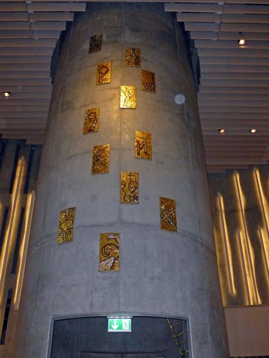 Wir sind fasziniert, wie toll die Kirche im Innern aussieht: Eine goldene Christusfigur mit ausgebreiteten Armen schmückt den Altar. Eine Hand ist offen, die andere zur Faust geballt. Die offene Hand soll die Bereitschaft zur Aufnahme aller darstellen, die geballte Faust die Stärke des Glaubens. Die Orgel zwischen den goldenen Säulen muss in dem runden Raum einen fantastischen Klang haben. Über dem Eingang befindet sich innerhalb des runden Kircheninnenraums ein weiterer runder Turm mit einer goldenen Leiter. Unser Reiseführer erklärt uns, dass es sich um eine Jakobsleiter handelt. Sie soll ausdrücken, dass man aus dem Dunkel der Erde jederzeit zum Licht des Himmels emporsteigen kann und dass oben im Himmel immer einer da ist, der über uns wacht und uns mit offenen Armen empfängt.