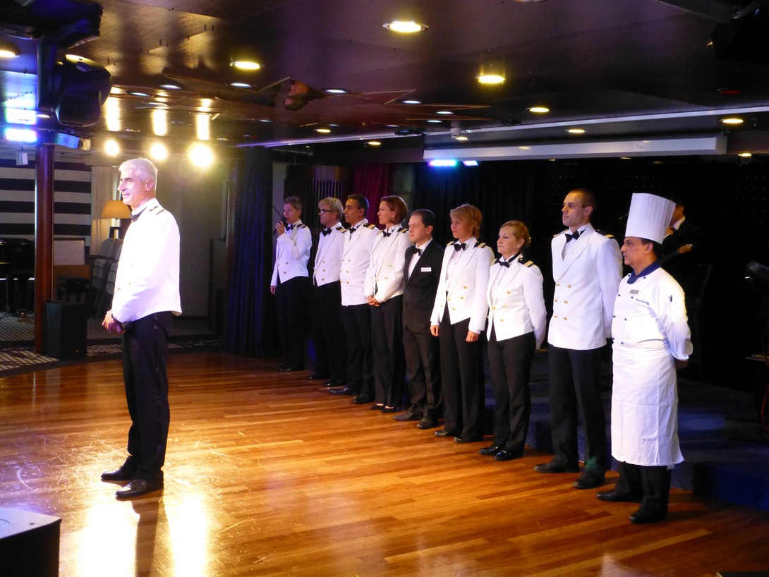 Um 17:15 Uhr findet der Kapitänsempfang mit Fotos und einem Welcome Drink in der Scirocco Lounge statt. Im Tagesprogramm stand die Kleidungsempfehlung "Festlich", also haben sich die Damen fein gemacht und ich habe mir ein Jakett mit Hemd und Krawatte angezogen. Die Fotografiererei fällt uns allerdings ziemlich auf die Nerven. Alle müssen sich vor einem Poster drapieren, werden geblitzt und müssen sich anschließend in die Schlange einreihen, um dem Kapitän die Hand zu schütteln und mit ihm fotografiert zu werden. Das dauert alles ziemlich lange und ist umständlich. Kapitän Ilias Venetantis stellt in englischer Sprache seine Offiziere vor und erklärt, wofür jeder verantwortlich ist. Der Kapitän und die 180-köpfige Mannschaft aus 16 Nationen wechseln wohl schnell, denn von der Truppe im Januar 2013 ist kaum noch jemand übrig.