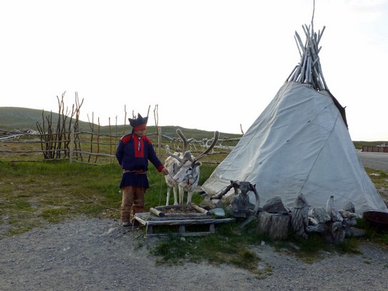 Nach einer halben Stunde machen wir eine Pause an einem Souvenirshop , das von der Ehefrau eines alten Samen geführt wird, der draußen in typischer Tracht neben einem Rentier für die Fotos der Kreuzfahrer posiert. In der Souvenirhütte kann man die Werkzeuge kaufen, die aus Rentiergeweihen hergestellt werden und zum Leben der Samen gehören. Es sind viele schöne Artikel angeboten und die Beiden machen sicher ein gutes Geschäft mit den sieben Bussen, die nacheinander hier ankommen und einen Stopp einlegen.