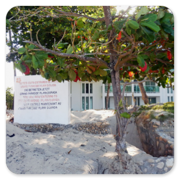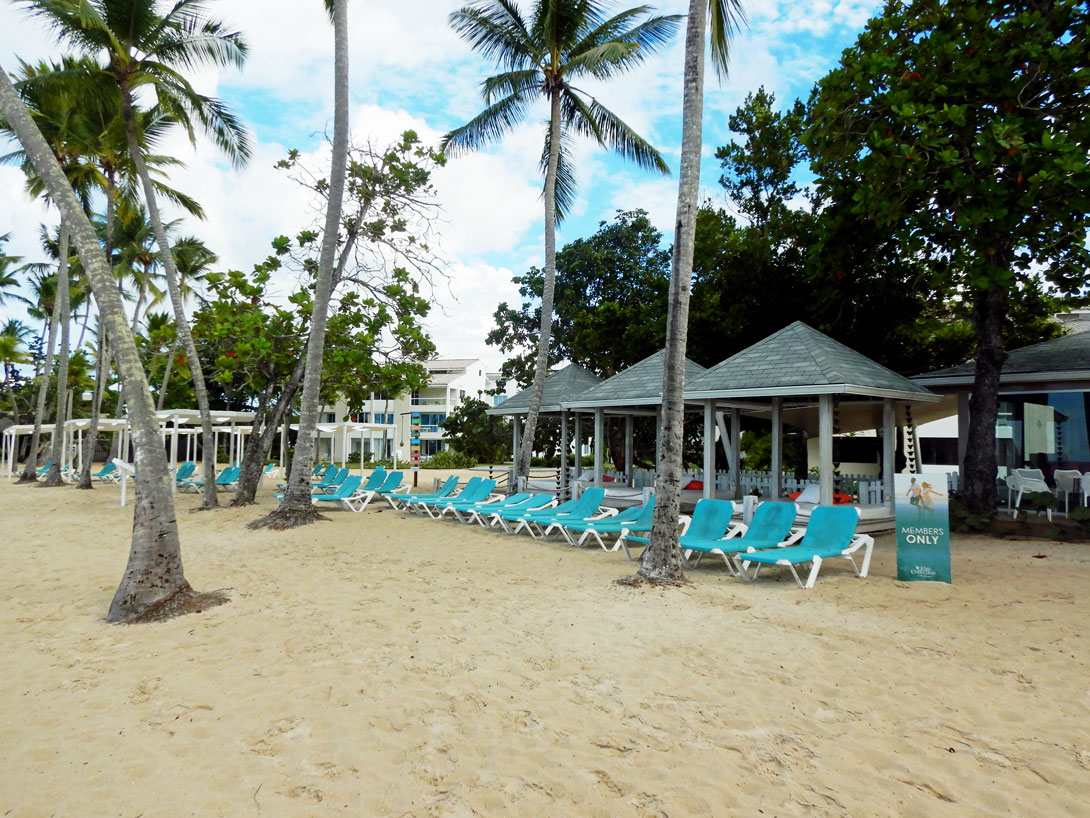 Die große Costa Dorada-Bucht ist hier zu Ende, denn das Be Live Collection Marién liegt am westlichen Ende der Bucht. Zu meckern gibt es nichts und wir sind zunächst begeistert, denn das Wasser ist sauber und es sind kaum Wellen vorhanden, weil etwa 200m vor der Bucht ein kleines Riff liegt. Außerdem ist das Meer wunderbar warm und der feinsandige Strand fällt flach ab, ohne Steine und Korallen. Das ist ideal zum Schwimmen. Inzwischen stellt sich bei uns eine gewisse Ferienlaune ein und wir freuen uns auf die nächsten drei Wochen. Die Duschen am Strand funktionieren nicht richtig und könnten besser sein, aber das ist halt in der Karibik so. Die Handtücher können wir leider nicht wie die anderen Hotelgäste am Activity Center umtauschen, weil wir größere VIP-Strand-Badetücher mit weiß-blauen Streifen haben, die uns als VIP-Gäste ausweisen. Wir müssen in der VIP-Lounge Bescheid sagen, damit sie täglich zusammen mit den Handtüchern im Zimmer gewechselt werden.