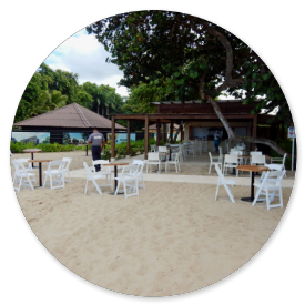 Auf dem Foto bauen die Kellner gerade die Tische für das Bonfire Dinner auf. Der Strand ist breit und sehr schön feinsandig. Allerdings liegt vorn auch viel Seegras.