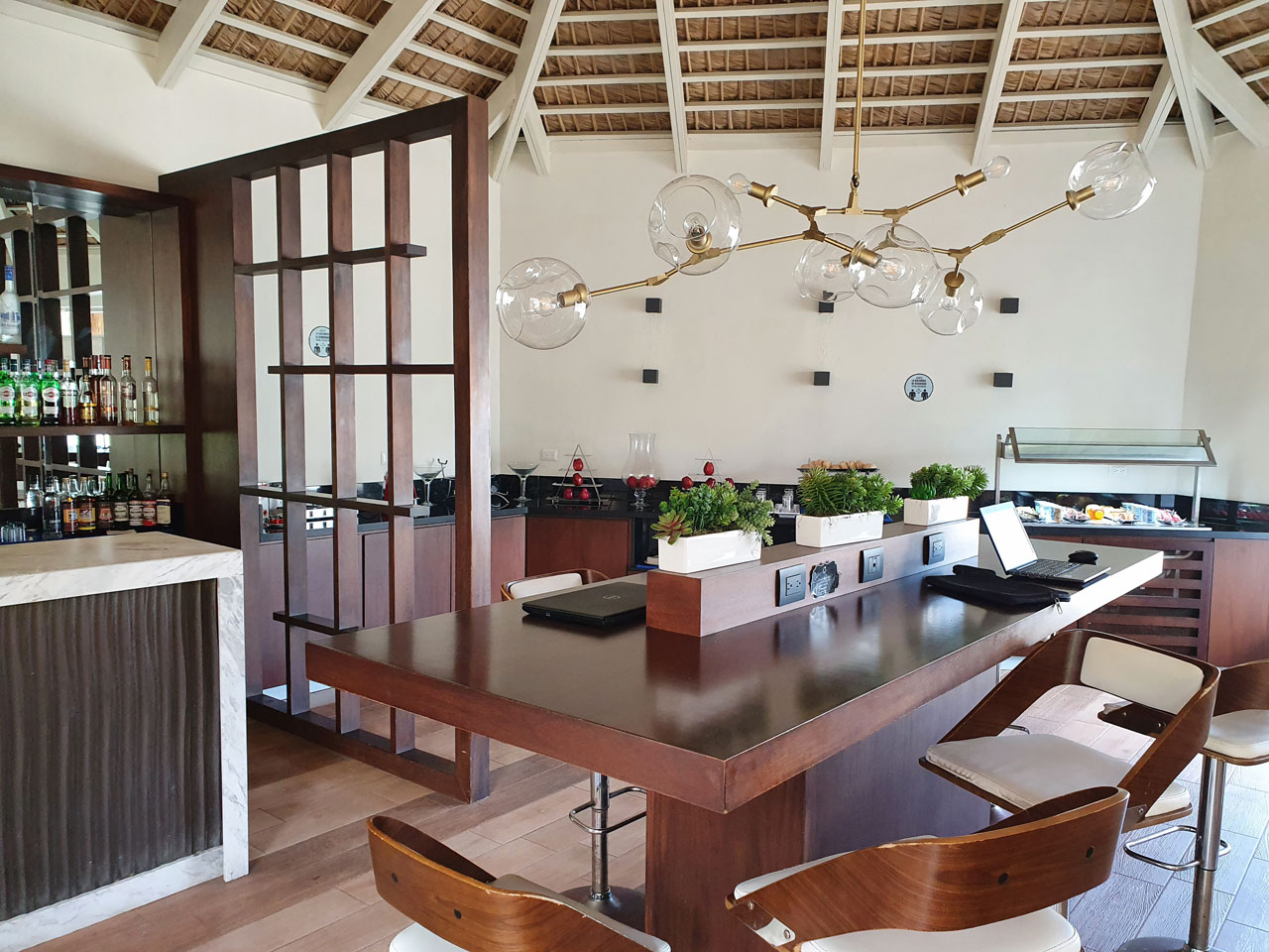 Die VIP-Lounge gefällt uns sehr gut, weil sie modern eingerichtet und das Servicepersonal sehr freundlich ist. Der Barmixer ist perfekt und serviert alle Drinks in richtigen Gläsern und nicht in Plastikbechern wie an den anderen Bars. Es sind drei Tische mit Stühlen vorhanden, sodass man sich gemütlich hinsetzen kann, wenn man die Snacks vom seitlichen Büffet genießen will. Sehr vorteilhaft sind die Internetplätze an dem erhöhten Schreibtisch in der Mitte des Raumes, weil die WLAN-Internetverbindung hier mit einem speziellen Code sehr viel besser ist als in dem gesamten anderen Hotelbereich oder in den Zimmern.
