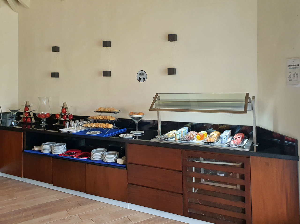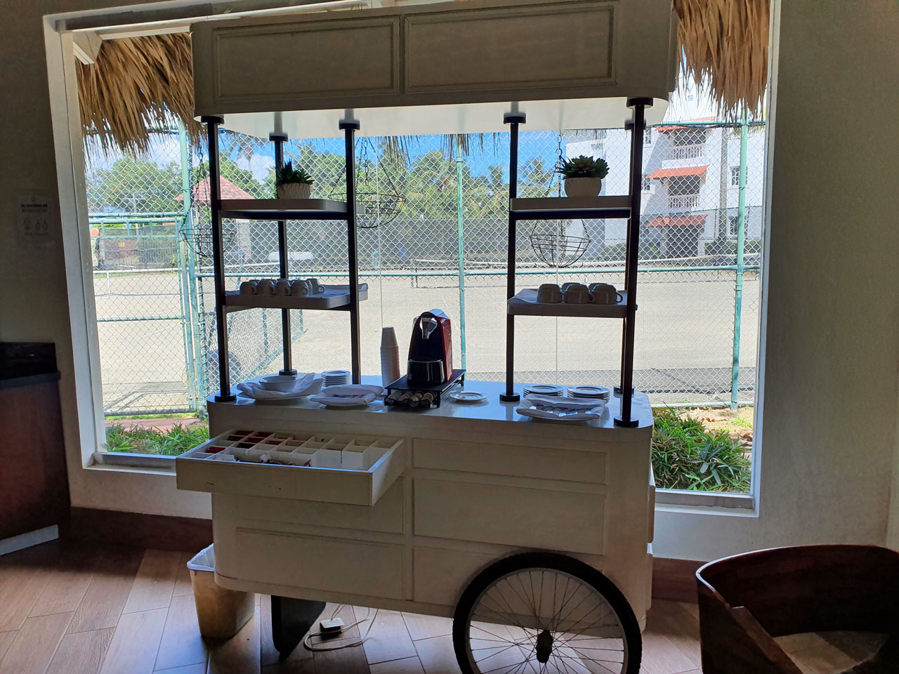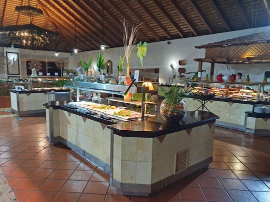 Das riesige Büffet ist gut sortiert und entspricht einem deutschen Hotel mit 4 Sternen. Jeden Tag gibt es ein Themenbüffet: orientalisch, italienisch, spanisch, dominikanisch, mexikanisch, international und sonntags ein Chef-Büffet. Neben vielfältigen Salaten, den Warmhaltepfannen und einem enormen Nachspeisenbüffet gibt es im hinteren Teil des Restaurants zwei Koch- und Bratstationen, an denen Köche Sonderwünsche erfüllen. An der Seite werden dazu von einem anderen Koch jeden Tag Pastas zubereitet. Alles ist sehr lecker und wir finden es interessant, dass keine Pommes Frites angeboten werden. Eigentlich ist für jeden etwas dabei. Ungewohnt ist natürlich die Leere in dem Büffet-Restaurant.