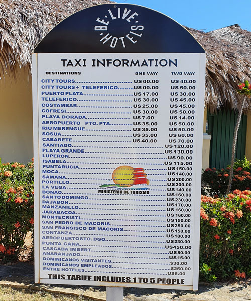 In der Ankunftshalle warten die Vertreter der Reiseagenturen und die Taxi-Mafia. Da wir keine Pauschalreise gebucht haben, brauchen wir nicht zu warten und wenden uns an den Taxistand. Die Preise sind auf einer großen Tafel angeschlagen und können nicht verhandelt werden. In unserem Fall sind es 35 $ für eine Fahrt vom Flughafen zu allen Hotels von Puerto Plata. 30 Minuten benötigen wir für die Fahrt zu unserem Hotel Be Live Collection Marién, das neben dem Iberostar Costa Dorada liegt.