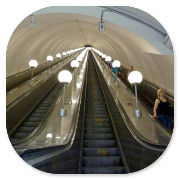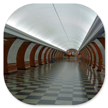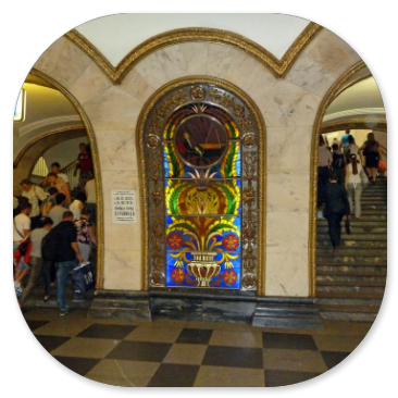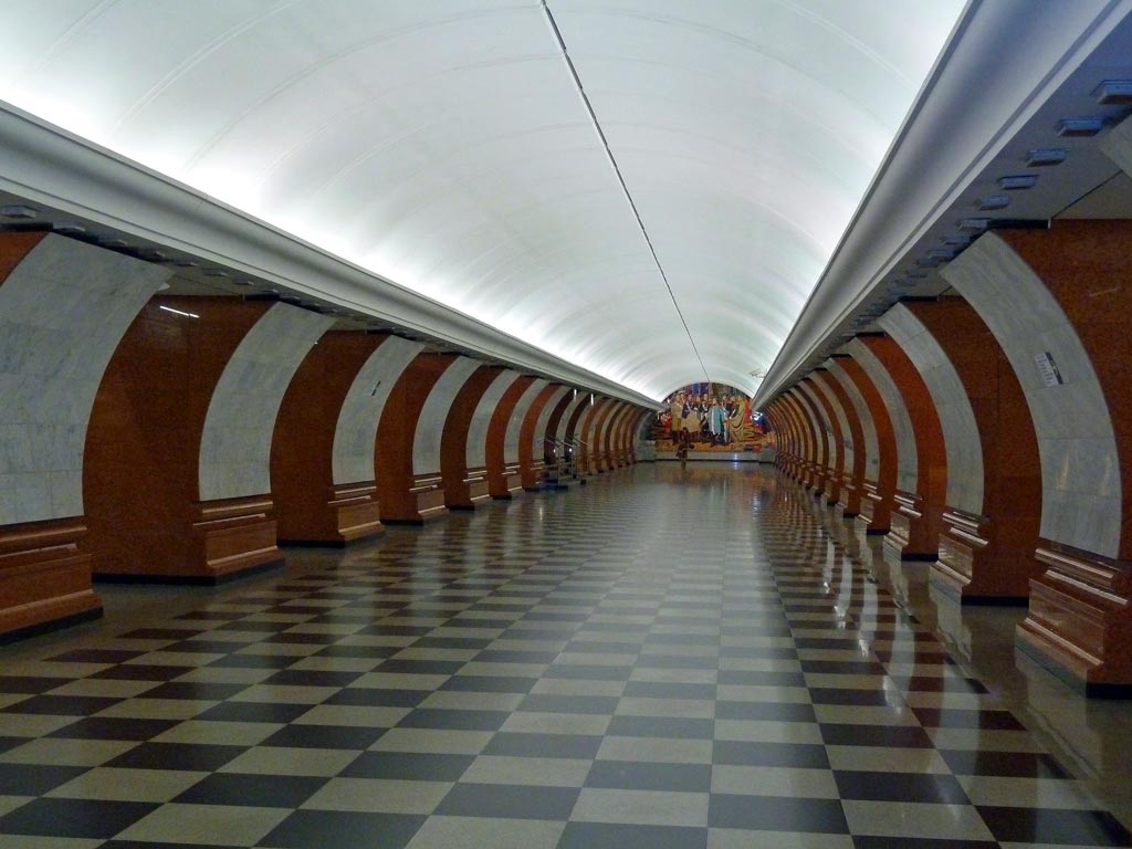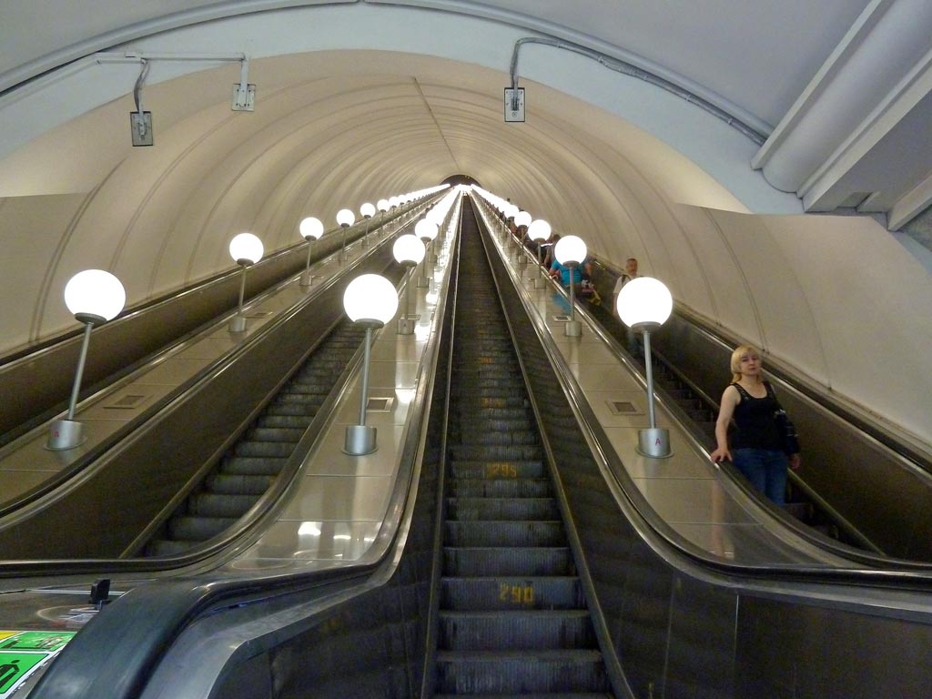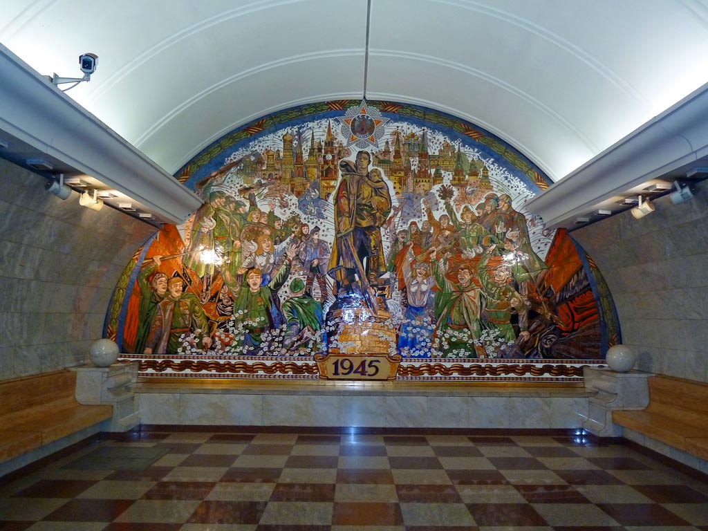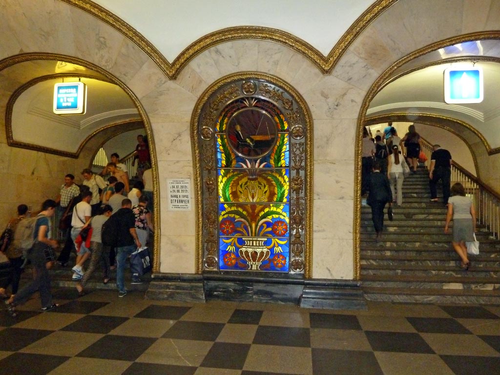 Von der Station Park Probedy fahren wir erst einmal mit der längsten Rolltreppe der Welt (147 m) etwa 80 m in die Tiefe und staunen unten über die blitzsauberen Gänge und die Gemälde an den Stirnseiten und Seitenwänden mit den vielen Durchgängen. Überall werden bestimmte Themenbereiche oder geschichtliche Ereignisse künstlerisch dargestellt. Alle 40 Sekunden kommt eine U-bahn und Tausende von Menschen wechseln in kürzester Zeit die Bahn. Es ist schon fantastisch. 9 Millionen Fahrgäste befördert die Metro jeden Tag. An der nächsten Station Kiewskaja sieht alles ganz anders aus: Hier sind die Wände mit Mosaiken gestaltet und in der nächsten Station wieder ganz anders. Hier sind jetzt überall Skulpturen an den Eingängen, die den russischen Arbeitern gewidmet sind. Manche Stationen sehen aus wie italienische Kirchen; andere wiederum haben bemalte Kirchenfenster, die von hinten beleuchtet werden. Hier eine kleine Fotostrecke davon: