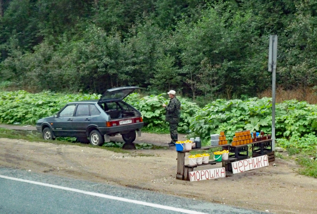 Am Straßenrand stehen oft Pilzsammler und Beerensammler, die ihre gesammelten Früchte zum Verkauf anbieten oder Bäuerinnen, die Marmelade aus Waldbeeren, Himbeeren, Brombeeren oder Johannisbeeren zum Verkauf auf Brettergestellen parat halten. Hier gibt es viele Pfifferlinge und gelbe Brombeeren, aus denen Marmelade gemacht wird. Unterwegs geht es durch eine Sumpflandschaft mit Birken, Espen und Mischwäldern.