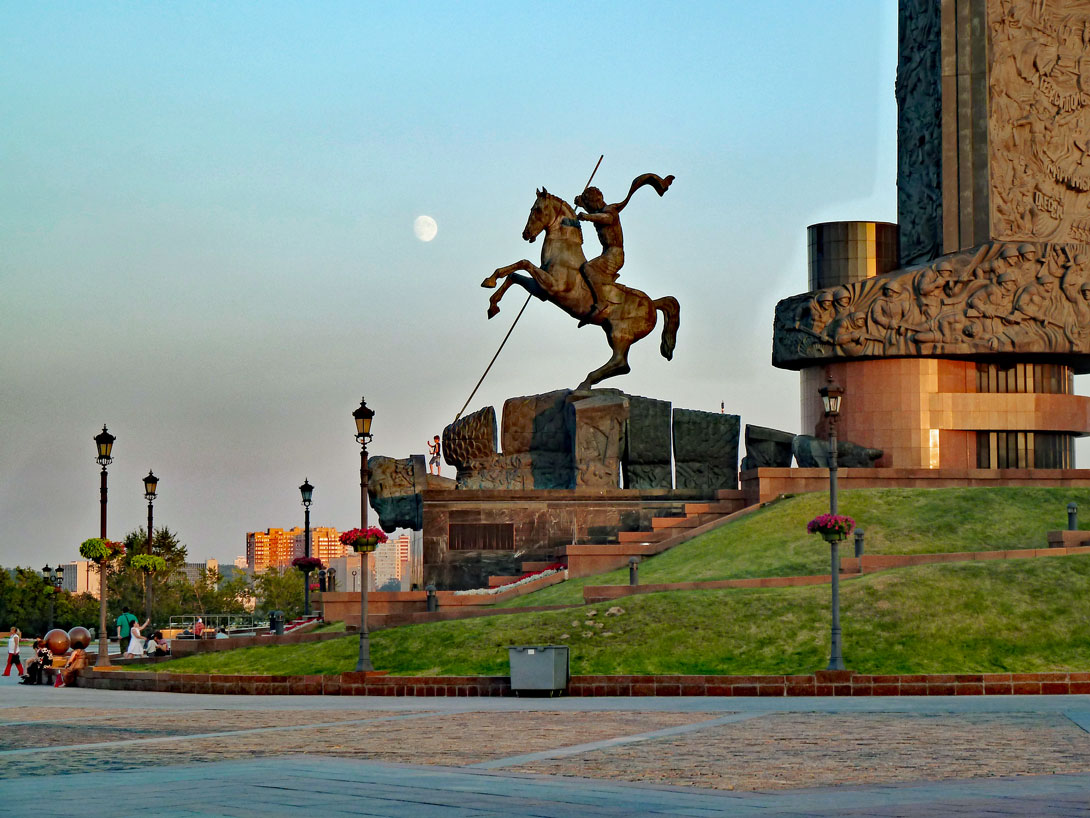 Um 20:30 Uhr fahren wir wieder mit dem Bus ins Zentrum und halten am Park Probedy, wo das Denkmal des Großen Vaterländischen Krieges steht, wie man den 2. Weltkrieg hier nennt. Der Siegespark gehört zu den bedeutendsten russischen Gedenkstätten und beherbergt nicht nur ein großes Kriegsmuseum, sondern auch eine Kirche, eine Moschee und eine Synagoge. Alles ist sehr monumental und erinnert uns stark an den Themenpark in Peking, der mit ähnlichen Säulen, Denkmälern und Springbrunnen gestaltet ist. Hier ist alles genau so im Kleinformat vorhanden und wir vermuten, dass die Chinesen ihren Themenpark mit den Ideen von hier geschaffen haben. Alles ist nämlich verblüffend ähnlich. Die Springbrunnen sind langweilig, weil sich die Fontänen nicht verändern, sie leuchten aber schön in der untergehenden Sonne.