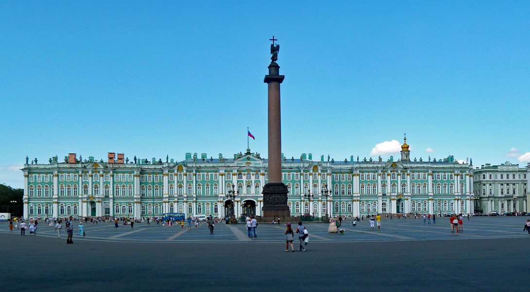 Heute morgen sind wir noch bei strahlendem Sonnenschein gestartet und haben den Winterpalast bei wolkenlosem Himmel fotografieren können. Und jetzt regnet es.