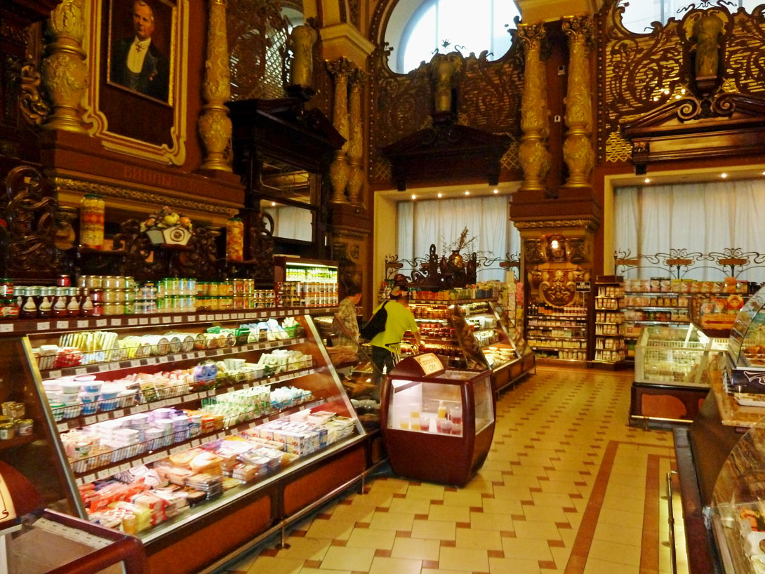 Da wir gerade auf der Uliza Twerskaja sind, spazieren wir zu Fuß weiter, erschrecken uns über die Autos, die mit viel Auspuffgeräusch und Imponiergehabe über die Straße sausen und werfen noch einen Blick in das tolle Delikatessengeschäft Jelissejew, das zu den edelsten Feinkostgeschäften Russlands gehört.