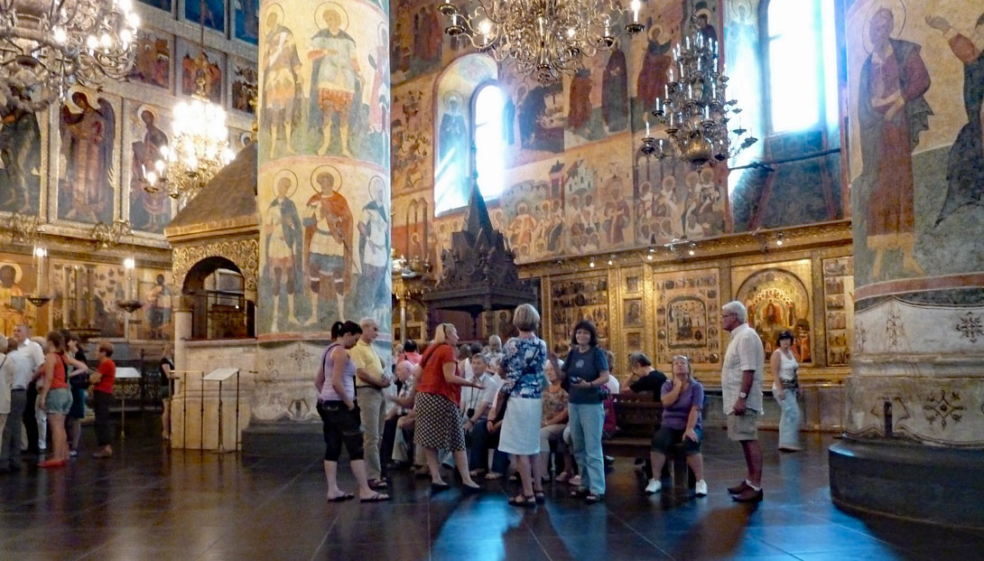 Sehr schön ist dagegen die Besichtigung des Kremls. Die 100 Gäste von Trendtours werden aufgeteilt und wir schließen uns einer deutsch sprechenden Reiseleiterin an, die uns den Kreml als Burg erklärt und das Festspielhaus zeigt und uns zur größten Kanone der Welt sowie zur größten Glocke der Welt führt. Ihre Sprache ist deutlich und die geschichtlichen Ausführungen gefallen uns sehr, denn so brauchen wir nicht mehr dem Geschwätz von Igor zuzuhören. Zunächst sind wir nicht nur beeindruckt von dem großen Terrain im Innern der 2,7 km langen Kremlmauer, sondern bekommen kompetente Auskünfte über die vielen Kirchen im Innenbereich des riesigen Befestigungskomplexes mit 20 Türmen, die wir gar nicht erwartet hatten. Wir besuchen die drei Kathedralen und staunen über die wertvollen Malereien an den Wänden, die in allen Farben leuchten.