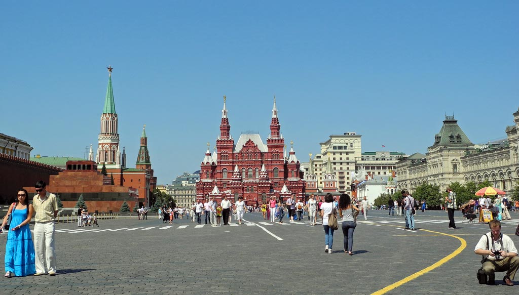 Auf dem Roten Platz: Links die Kremlmauer, davor das Mausoleum Lenins, im Hintergrund das historische Museum und rechts das Warenhaus Gum.