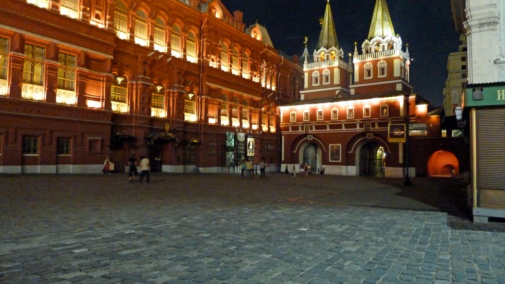 Wir unterbrechen unsere Fahrt in Kiewskaja, in Mendelejewskaja, in Komsomolskaja und in Kurskaja, bevor wir in Theatralnaja aussteigen. Dort staunen wir über die erleuchteten Fassaden rund um den Roten Platz.