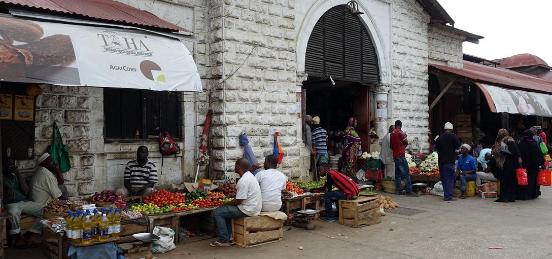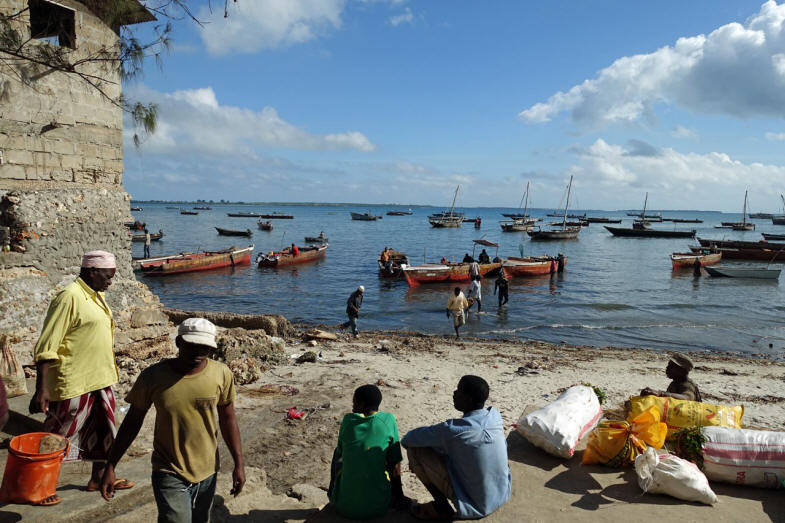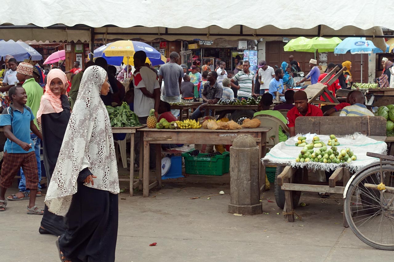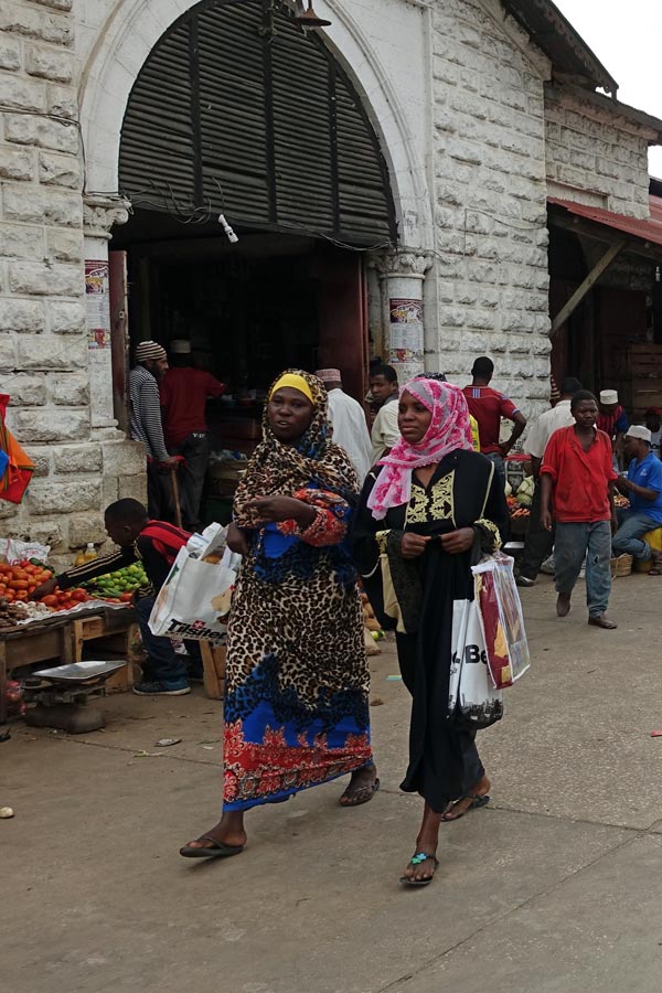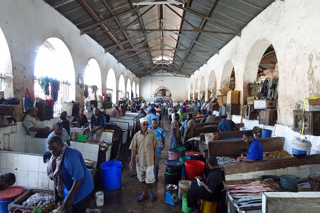 Eine Stunde später sind wir in Stonetown und spazieren über den Markt. Auf der einen Seite der Markthalle werden die Fische an die Händler versteigert, die sie 20 m weiter in der Halle an die Kunden verkaufen.