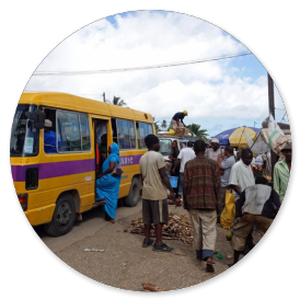 Nachdem wir aus dem Flughafengelände heraus sind, begegnet uns die raue Wirklichkeit der Insel: Es ist früh am Morgen und alle sind auf dem Weg zur Arbeit: Zu Fuß, mit Fahrrädern oder mit dem Bus. "Bus" heißt auf Kiswahili "basi". Die Fahrt von Stonetown nach Nungwi gibt unser Fahrer für die 60 km mit etwa einer Stunde und 15 Minuten an. Mit dem Taxi kostet das zwischen 60 und 80 Dollar, mit dem Bus nur etwa einen Dollar. Dafür muss man dann aber eine Zeit von etwa 4-5 Stunden einrechnen, denn der Bus hält in jedem kleinen Dorf und an jeder Haltestelle.