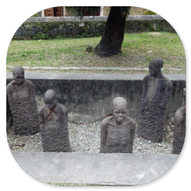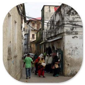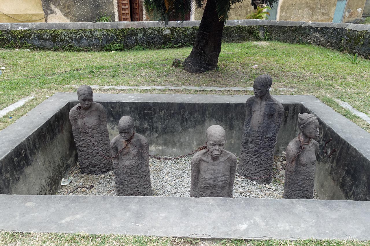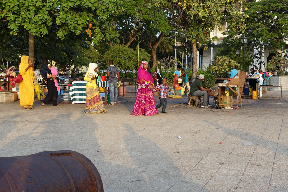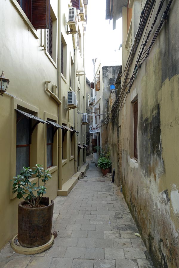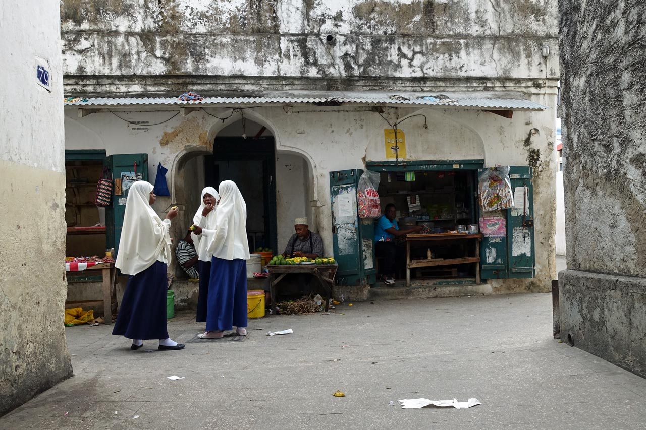 Die Hauptstadt von Sansibar hat 250 000 Einwohner und hat ihren Namen dadurch, dass hier im 19. Jahrhundert schon sehr viele Häuser aus Korallen- Kalkstein gebaut wurde. Als wir durch den Stadtteil Michenzani fahren, weist uns unser Guide auf die Häuser hin, die von deutschen Architekten gebaut wurden. Wir sind sehr erstaunt über diese grauen Steinkästen und können es gar nicht glauben. Aber es waren in der Tat Architekten aus der ehemaligen DDR, die in den 70er Jahren solche Plattenbauten hier erstellten. Ein Stück weiter halten wir am ehemaligen Sklavenmarkt und gehen von dort aus weiter zu Fuß durch die Altstadt.
